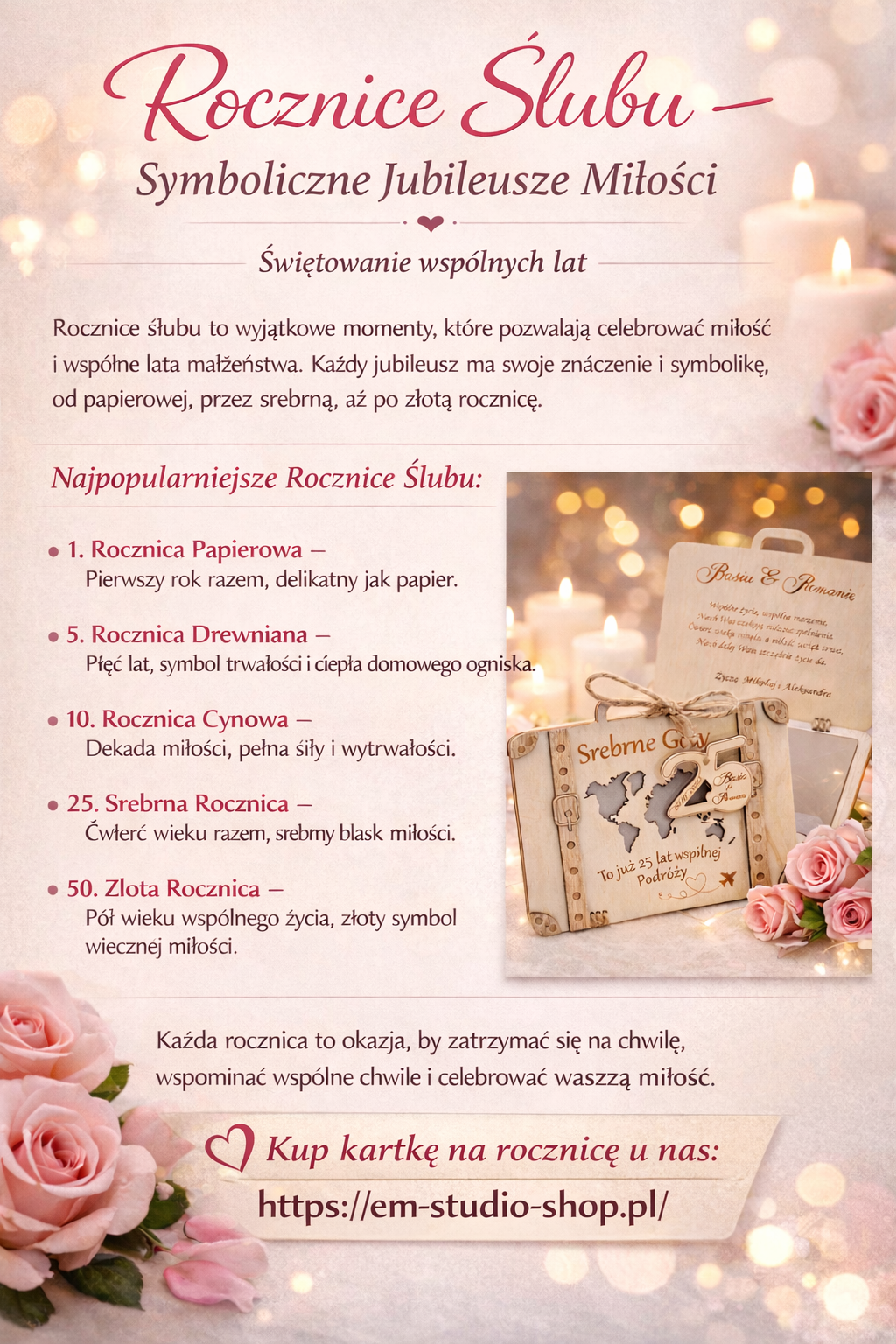 Rocznica ślubu to nie tylko kolejna data w kalendarzu. To wyjątkowy moment, w którym można zatrzymać się na chwilę i docenić wspólnie spędzony czas, emocje oraz wszystkie przeżyte chwile. Każdy rok małżeństwa ma swoją symbolikę – a wraz z nią pojawiają się inspiracje na idealny prezent.