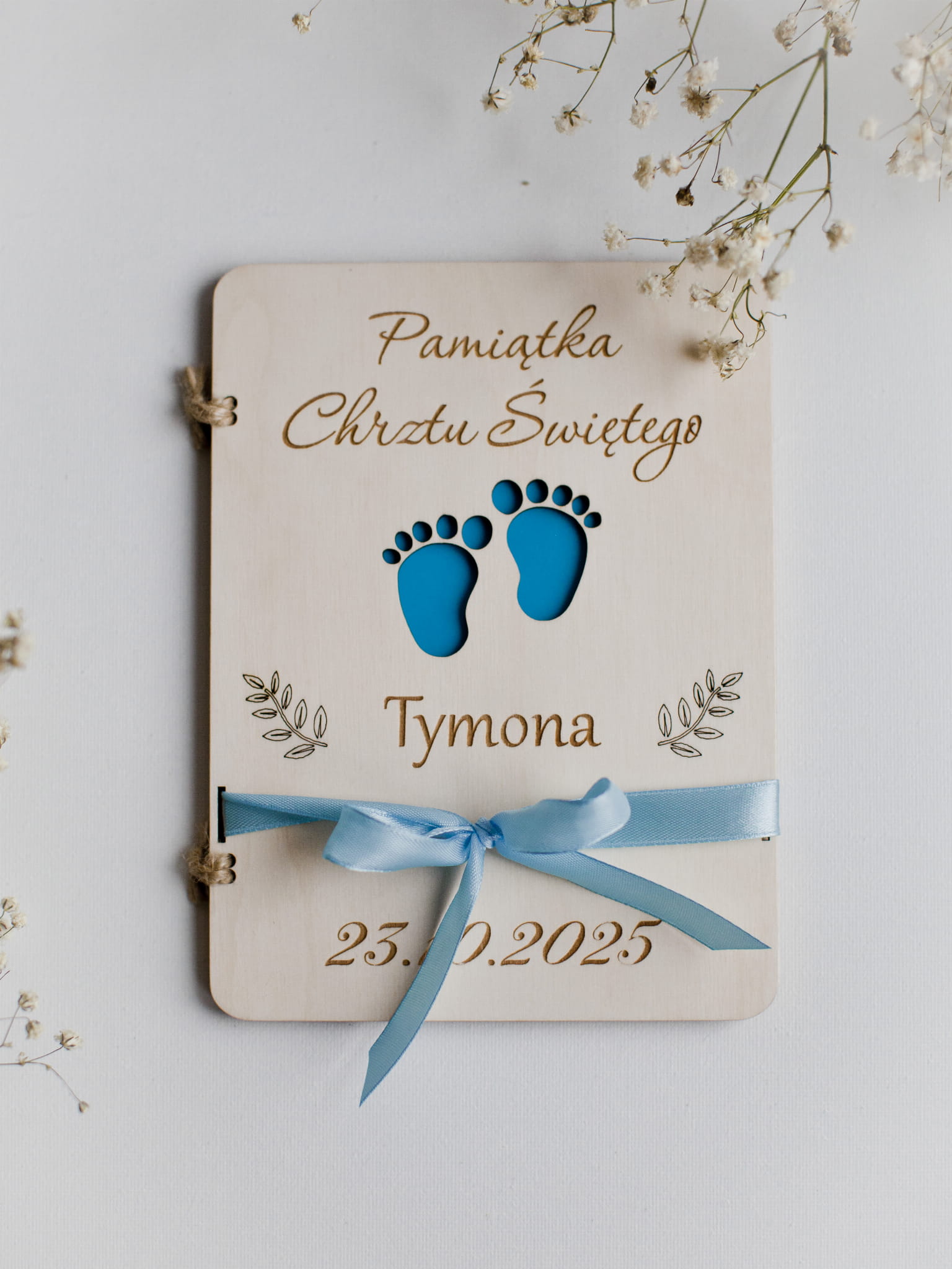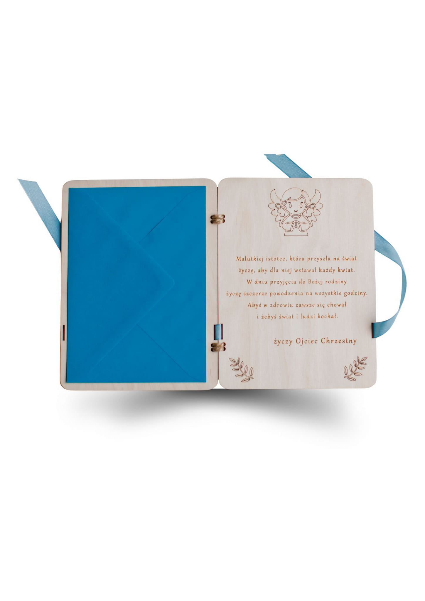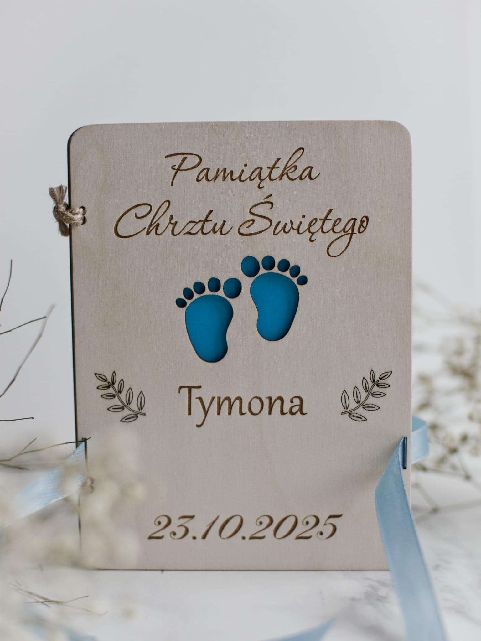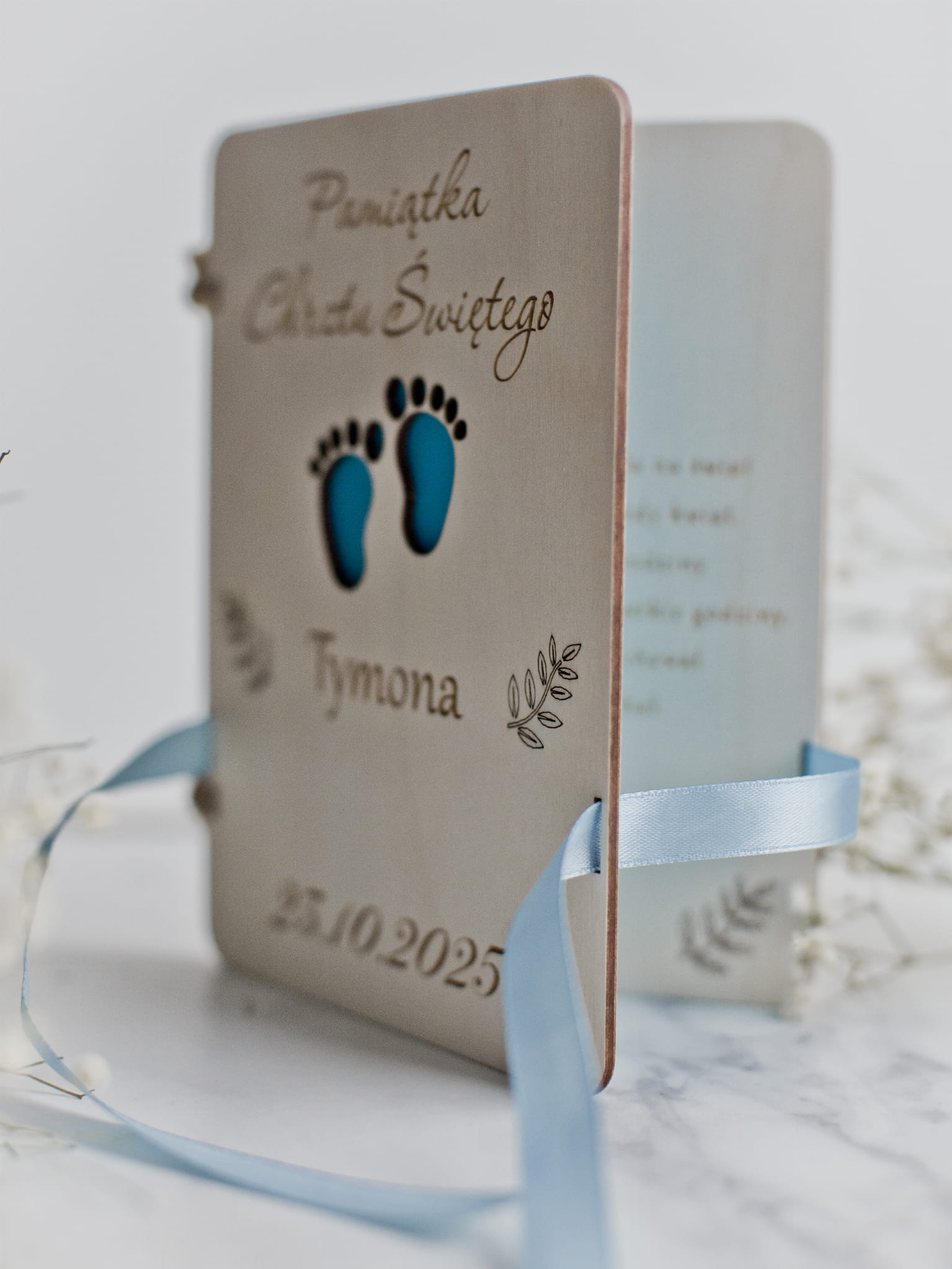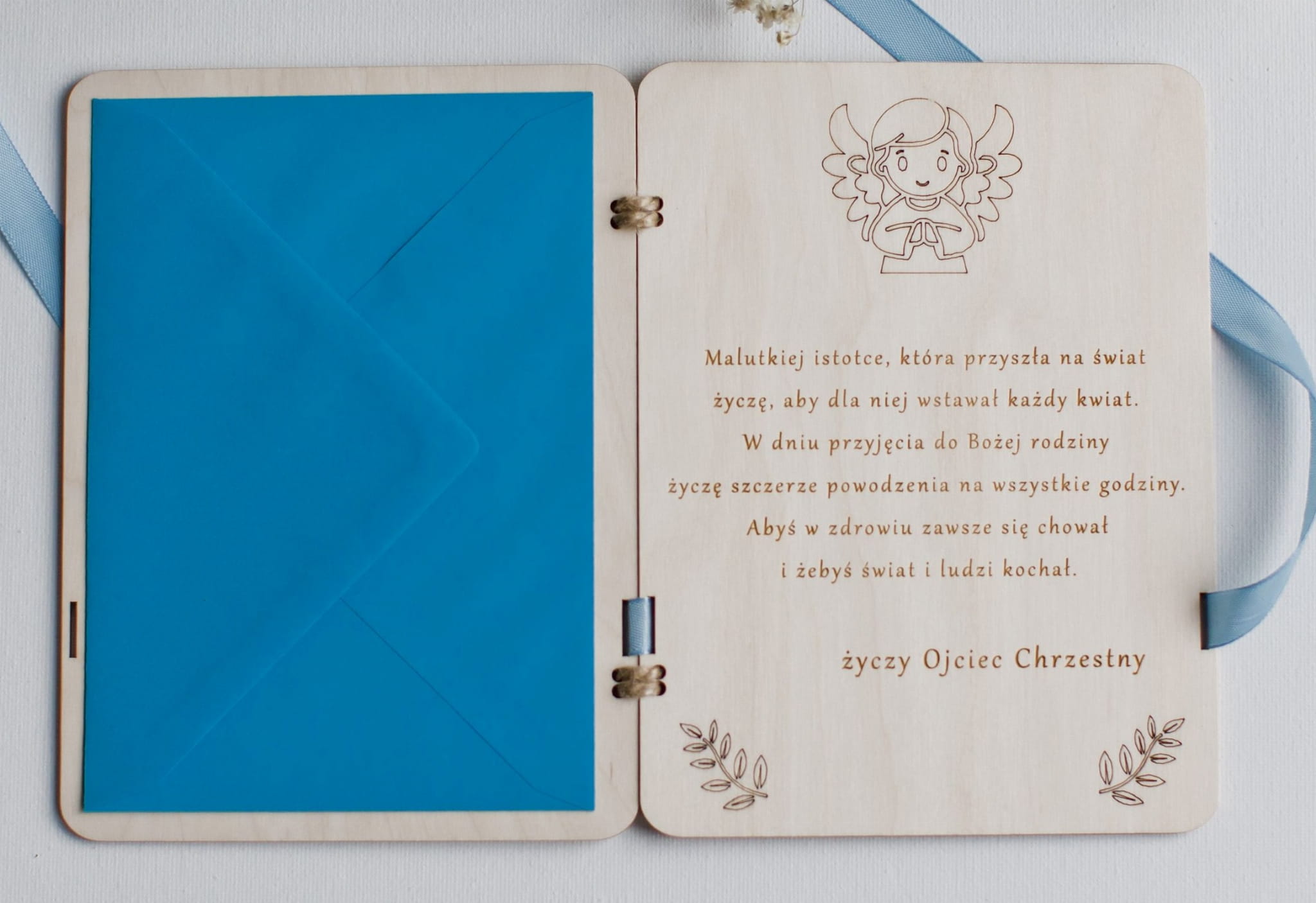 Oferujemy piękną, personalizowaną kartkę pamiątkową wykonaną ze sklejki brzozowej o grubości 3 mm. To niepowtarzalna pamiątka Chrztu Świętego, która na długo pozostanie w sercu i pamięci dziecka oraz jego rodziny.