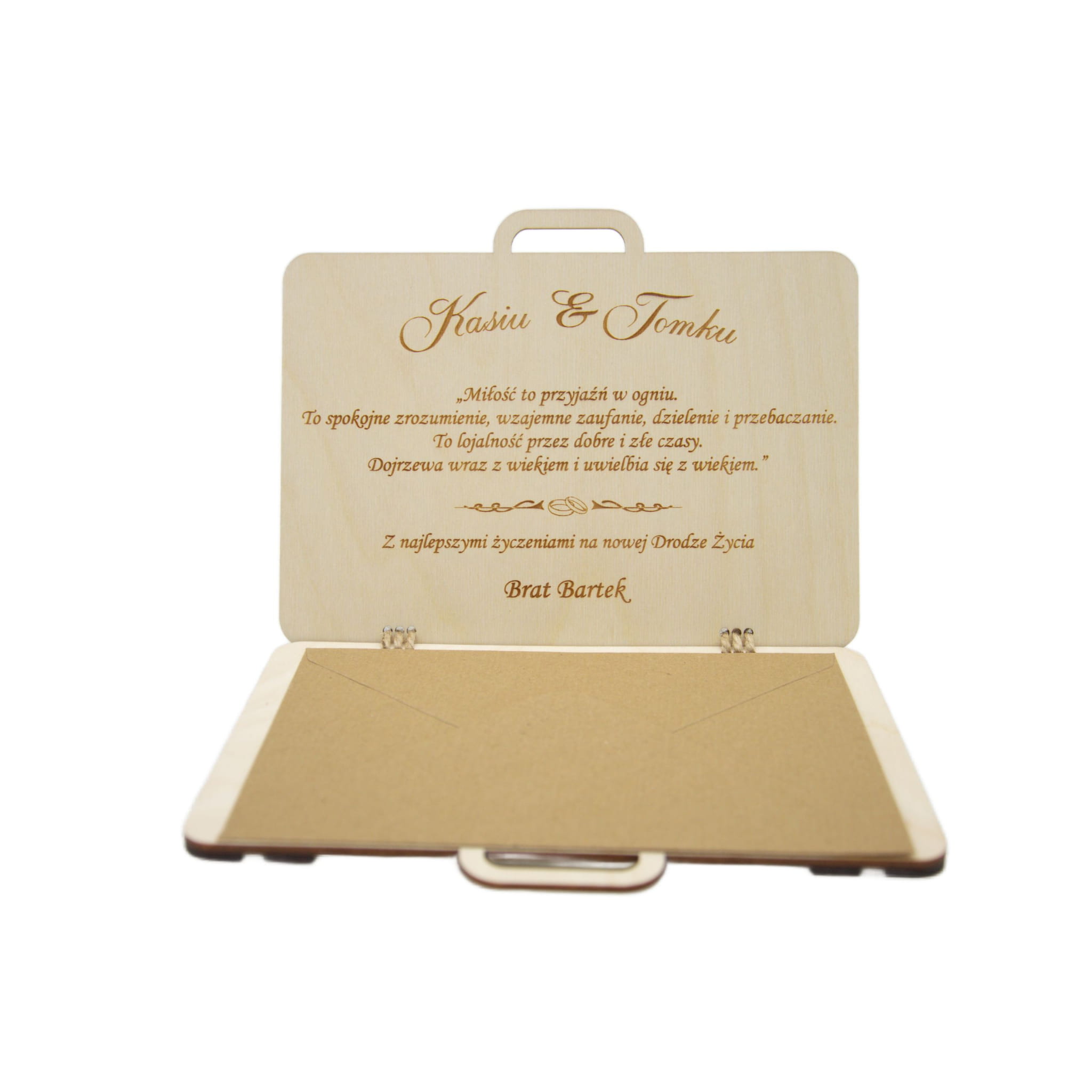 ➡️ Wysokiej jakości drewno – trwałe, eleganckie, przyjemne w dotyku ➡️ Personalizacja – imiona Pary Młodej i data ślubu na ozdobnej zawieszce ➡️ Bezpieczna koperta na pieniądze w środku – idealna na gotówkę, bony, vouchery ➡️ Unikalny design – drewniana walizka, która wyróżnia Twój prezent spośród innych ➡️ Trwała pamiątka ślubna – zachowa swoje piękno przez wiele lat