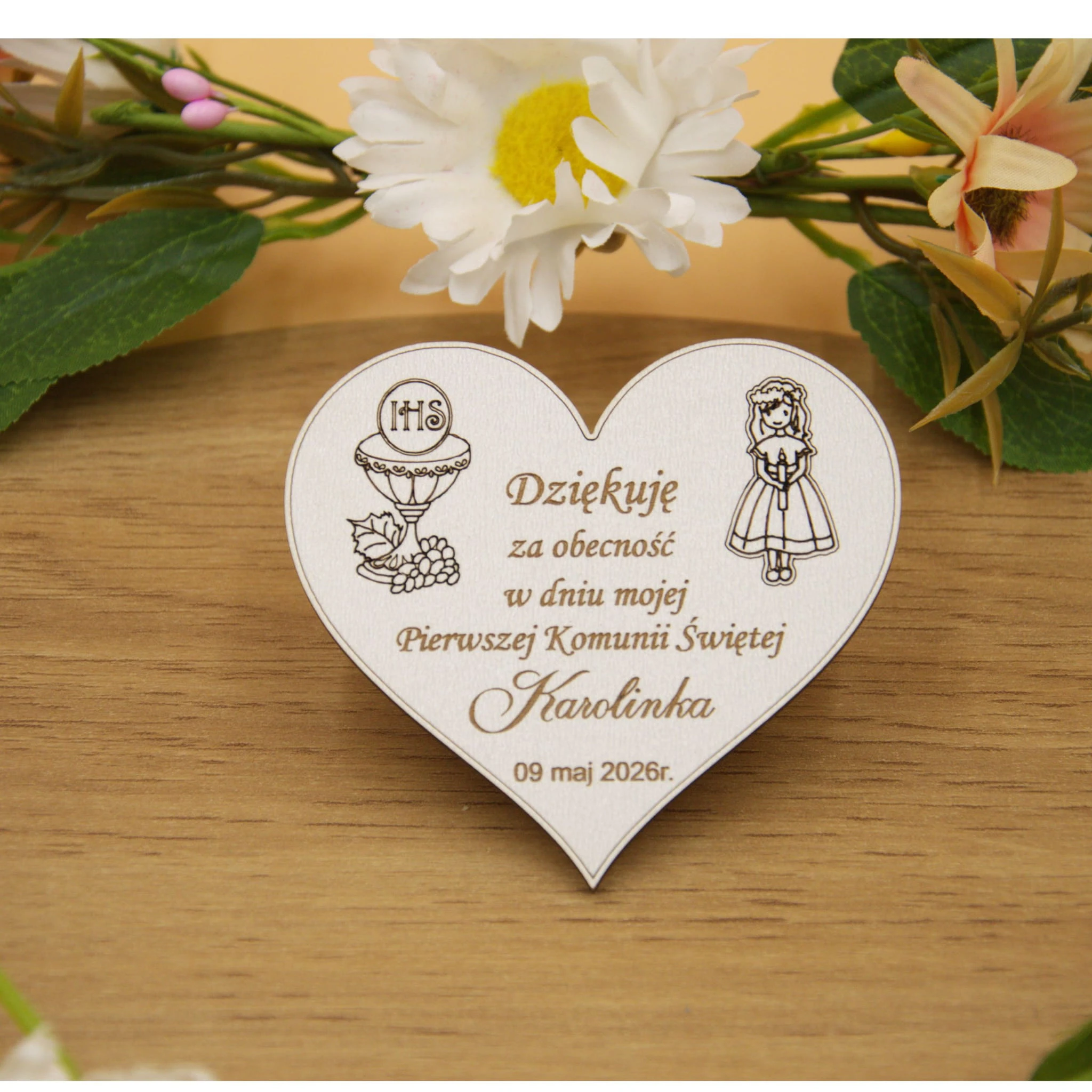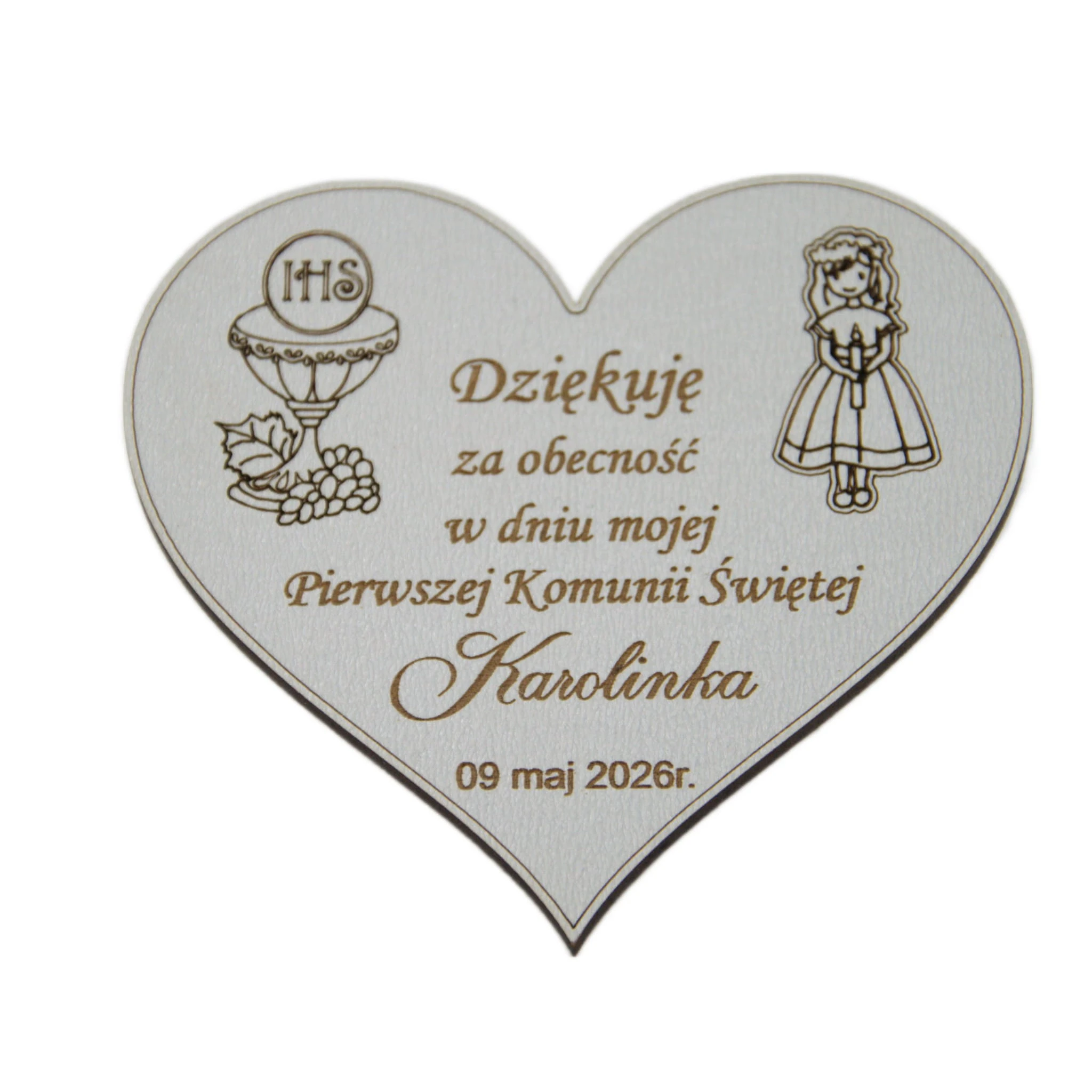 – idealne podziękowanie dla gości na Pierwszą Komunię Świętą. Wymiary: 8 × 7 cm. Możliwość dodania imienia i daty uroczystości. Elegancka i trwała pamiątka komunijna.