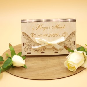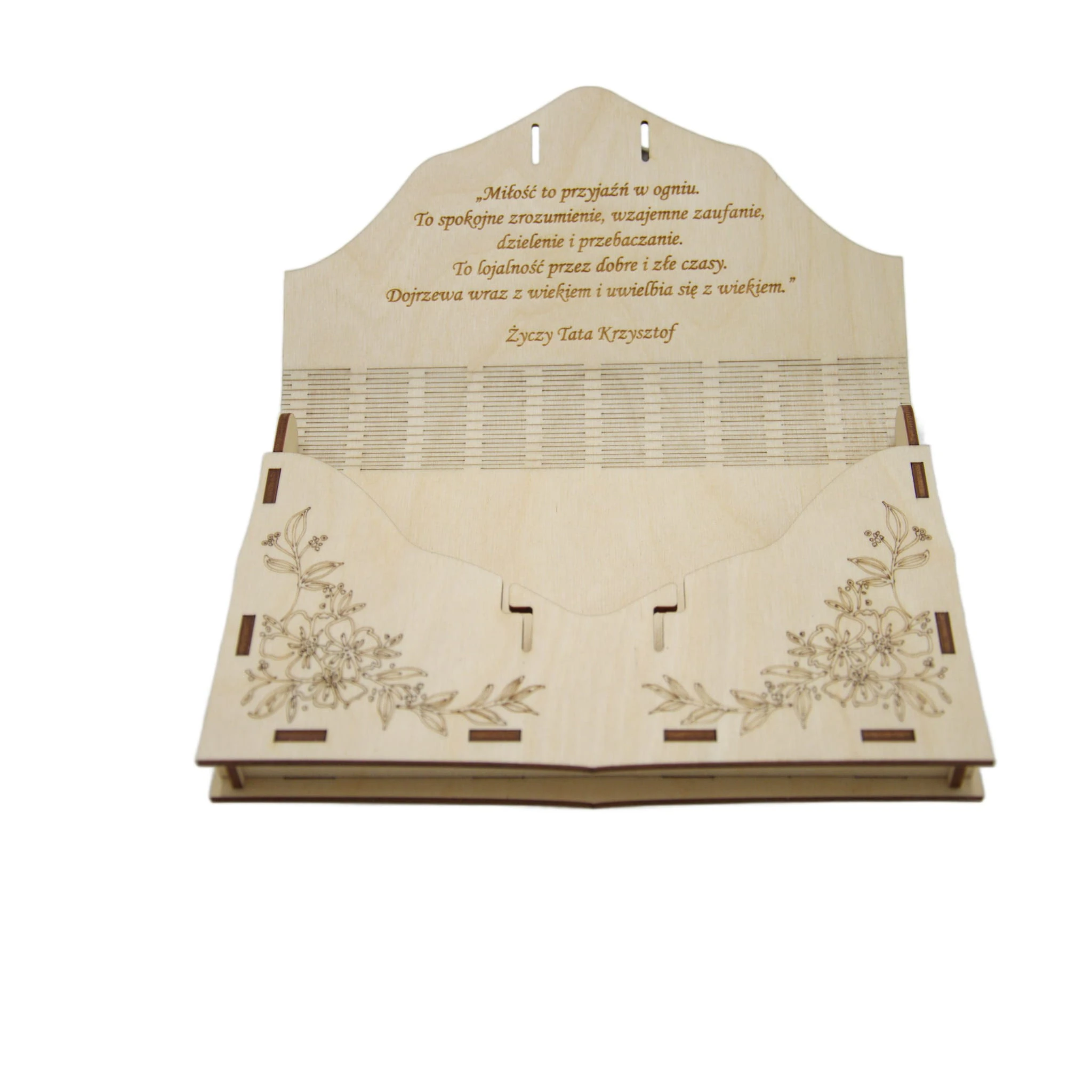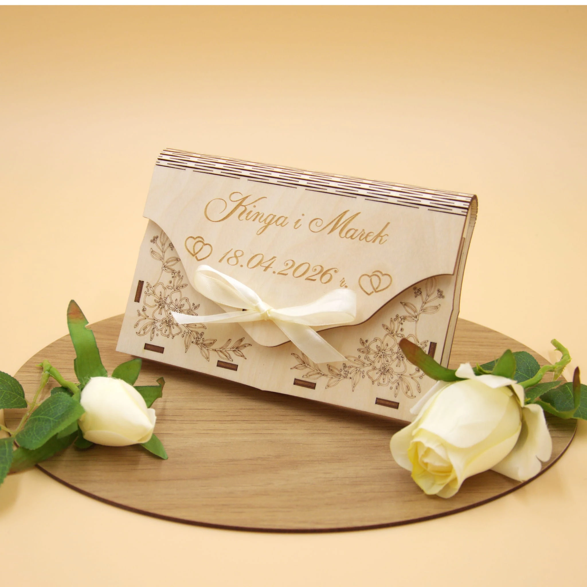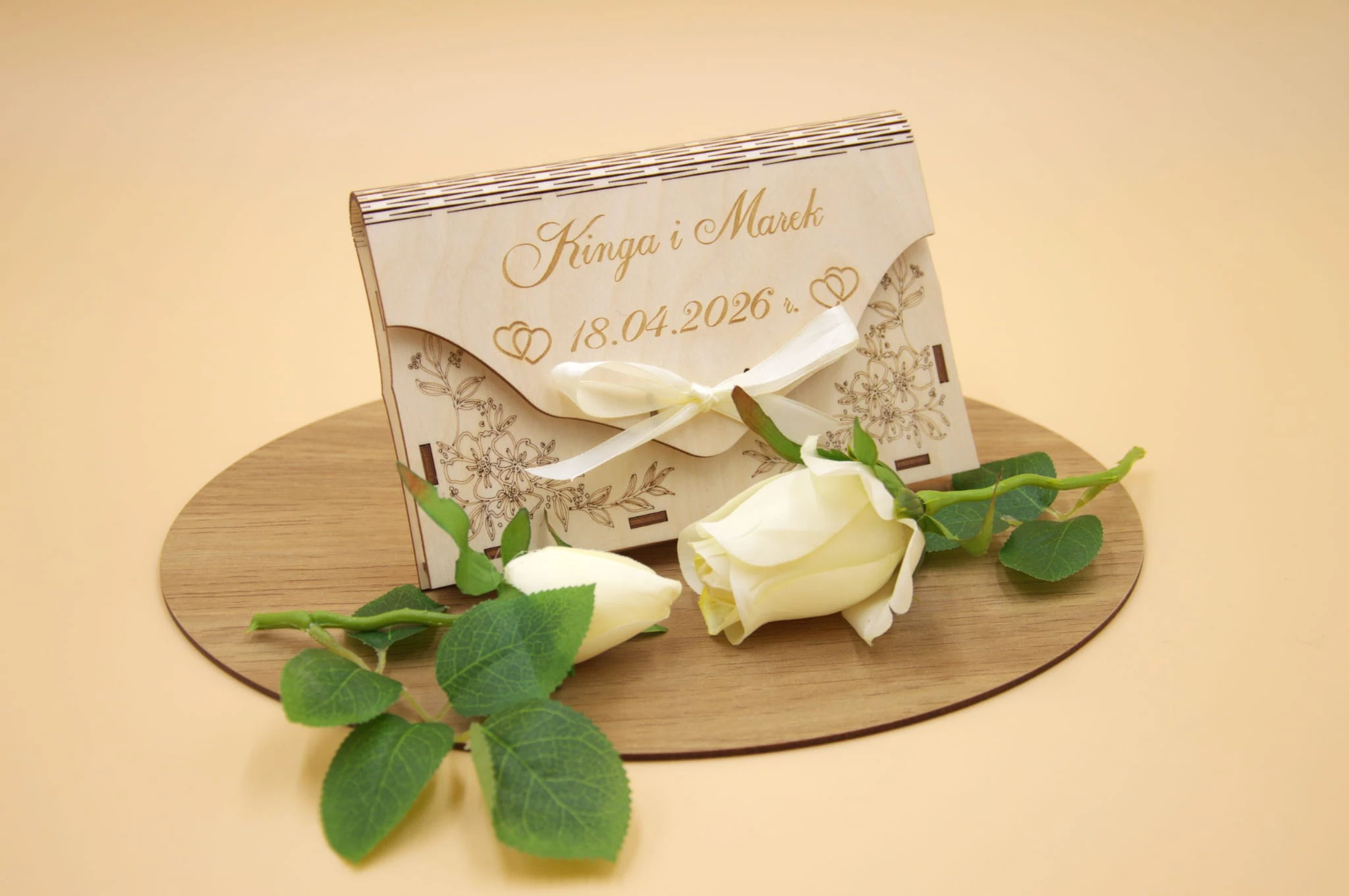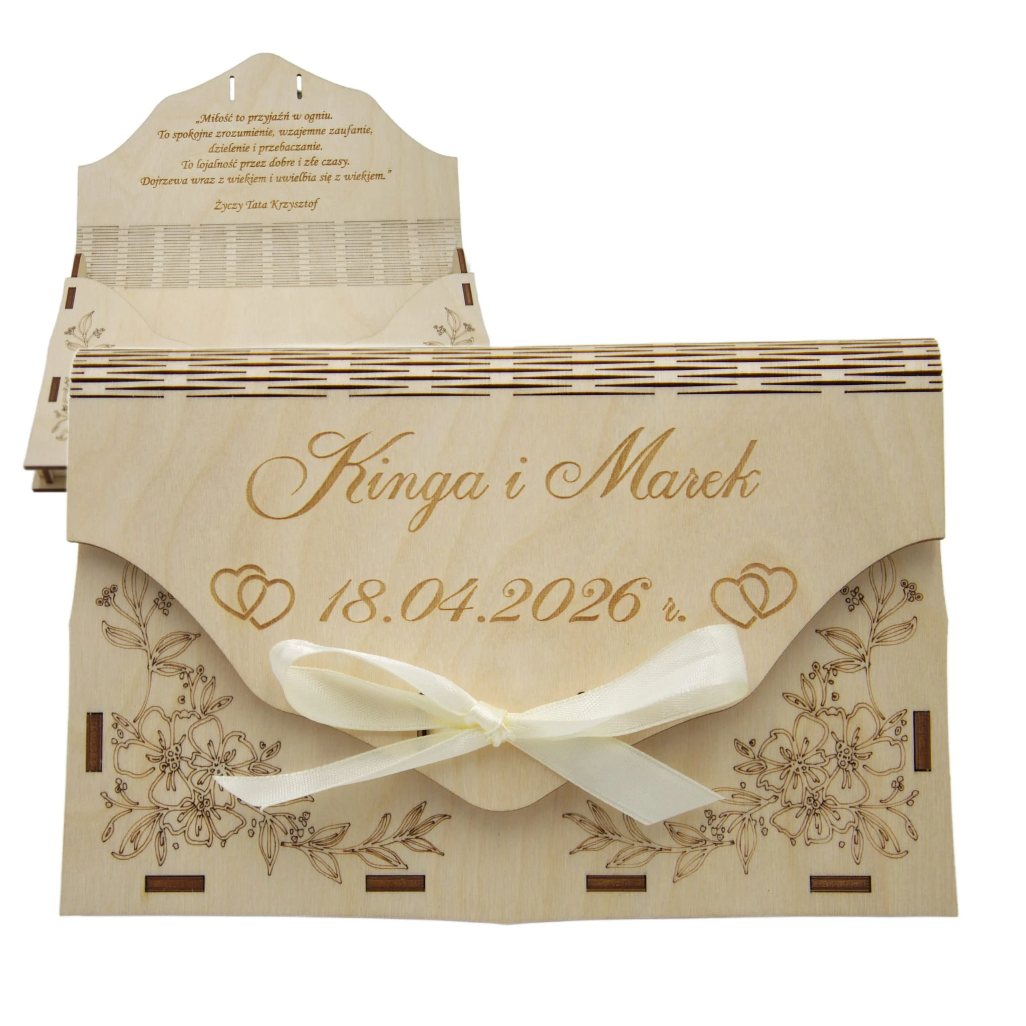 Szukasz oryginalnego prezentu na ślub? Nasza drewniana koperta na pieniądze to wyjątkowa propozycja dla osób, które chcą podarować nie tylko gotówkę, ale również niezapomnianą pamiątkę ślubną. To doskonała alternatywa dla klasycznej koperty – praktyczna, elegancka i w pełni personalizowana.