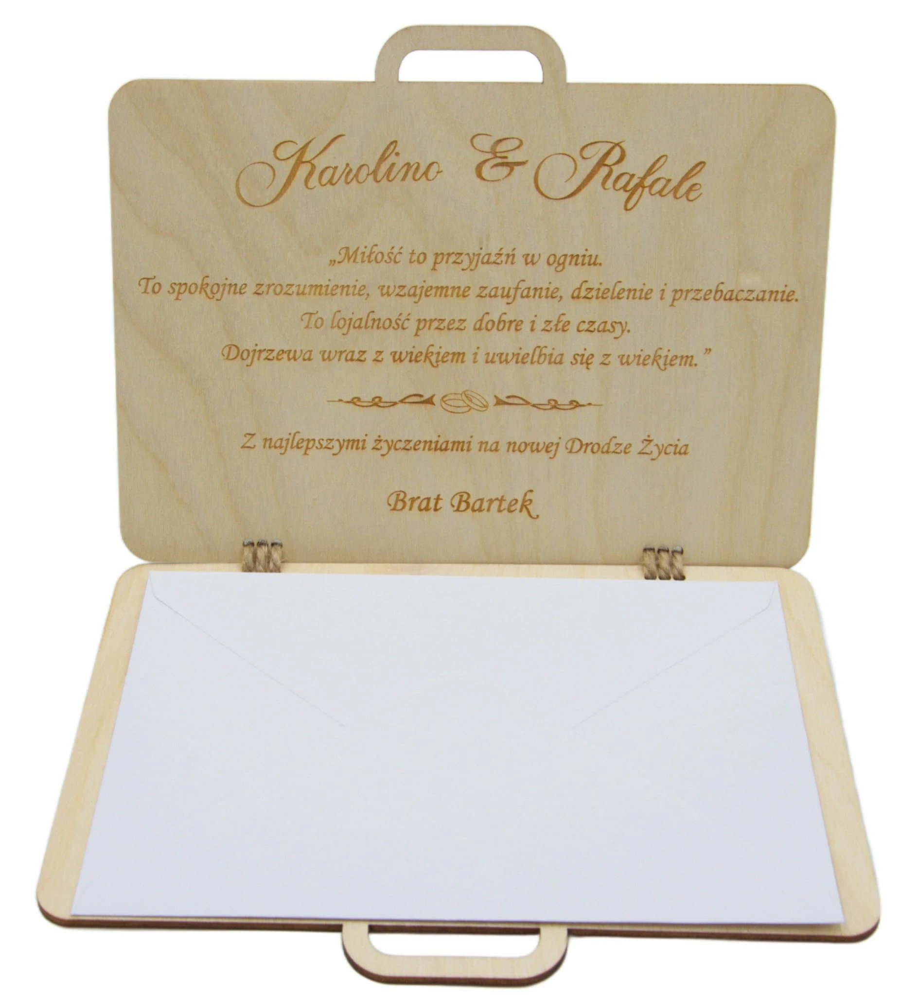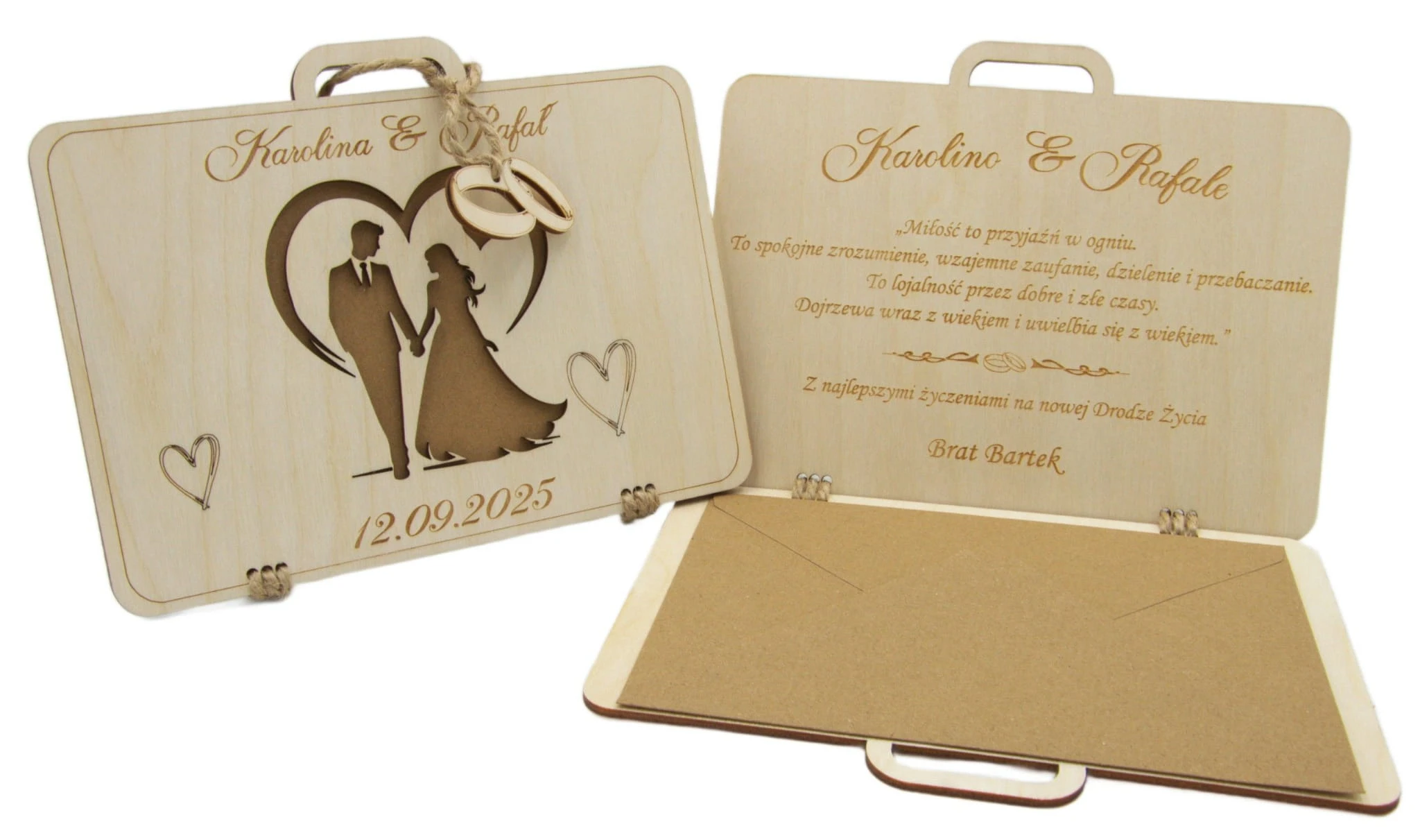 Drewniana kartka-walizka ✨ personalizowana pamiątka ślubna i elegancki prezent na wesele ✨ koperta ślubna na pieniądze, vouchery lub bony – trwała i wyjątkowa.