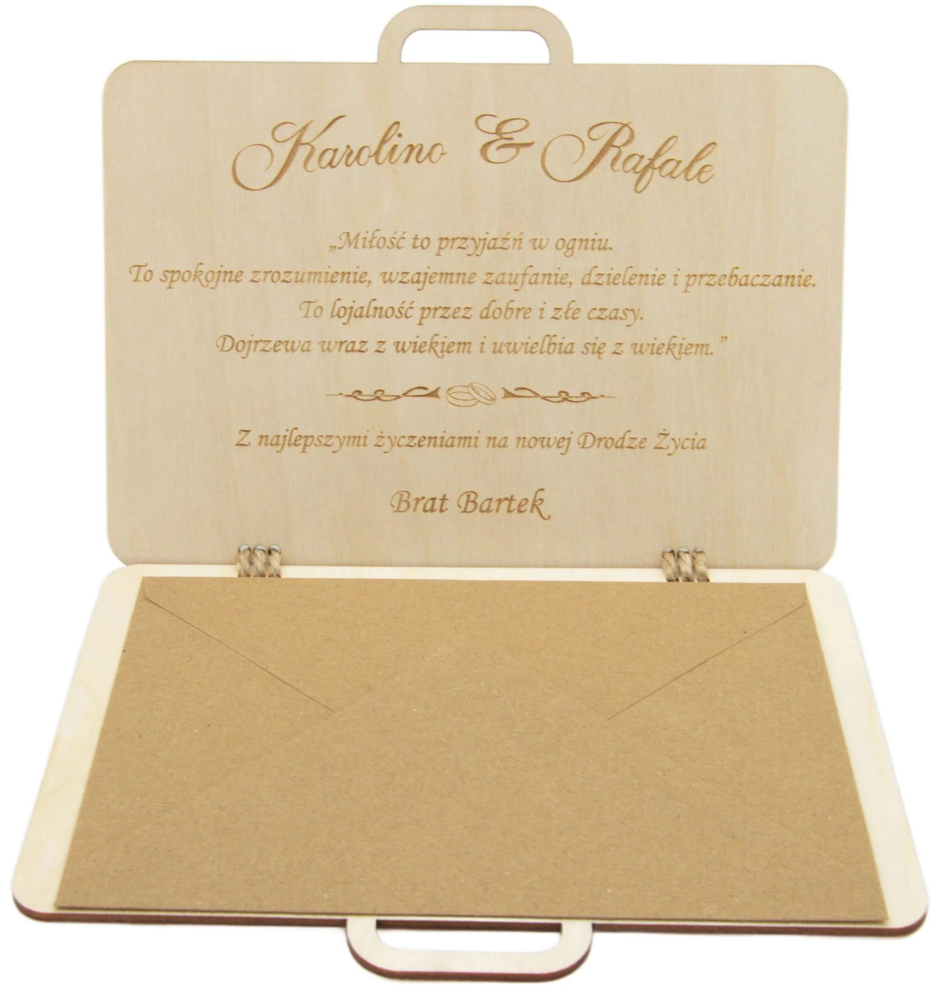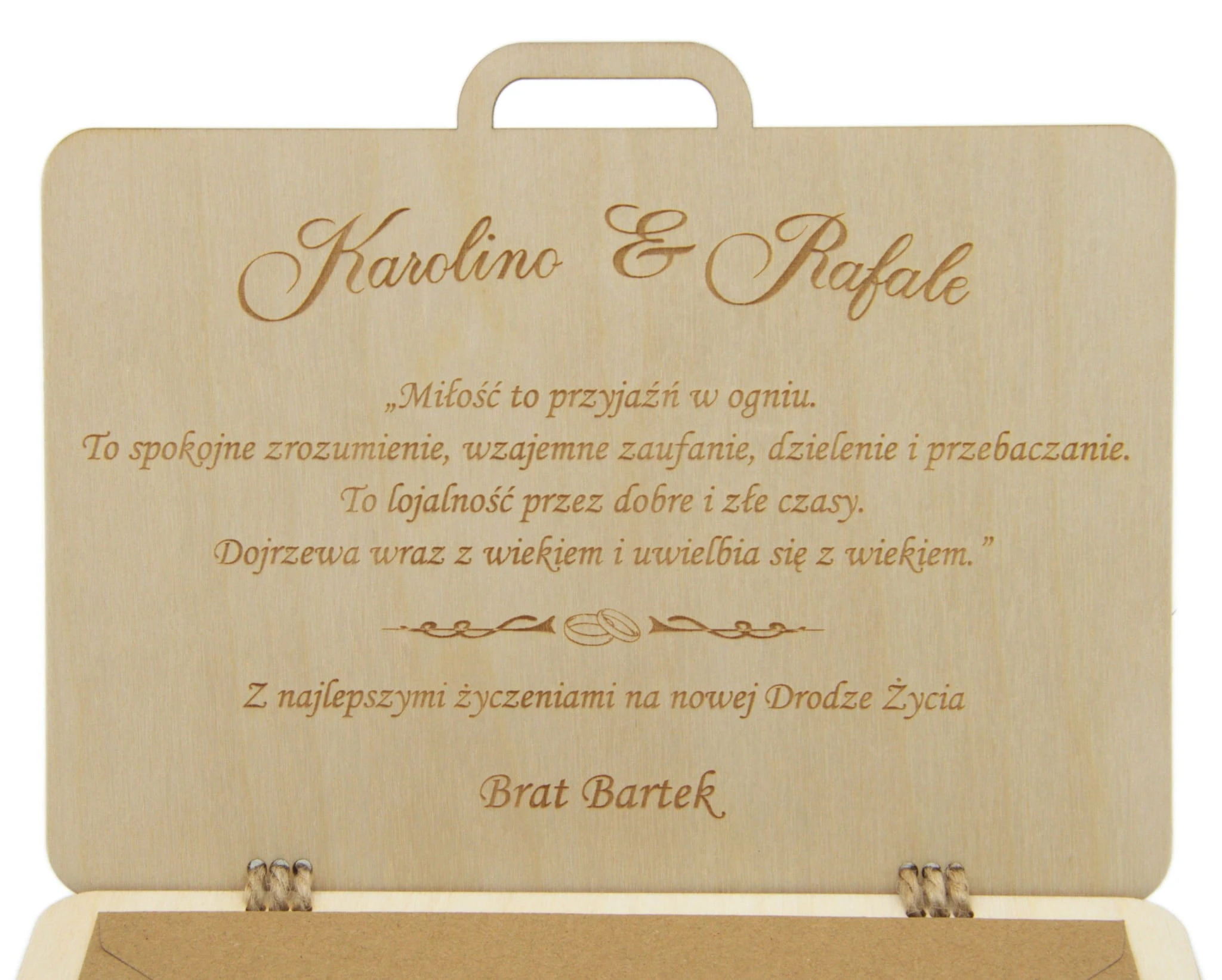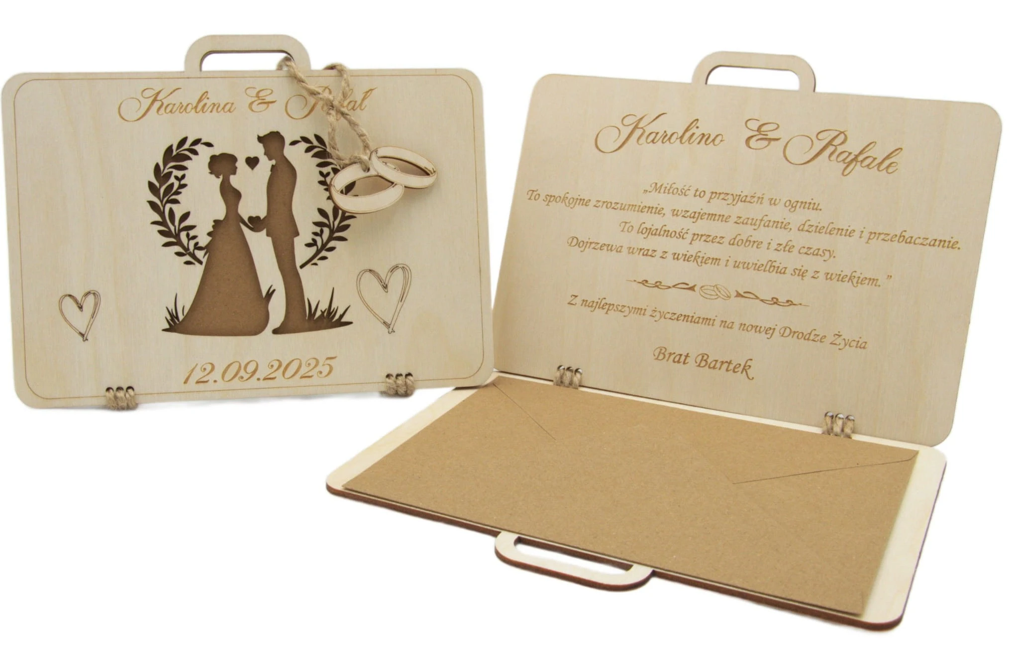 Drewniana kartka-walizka ✨ personalizowana pamiątka ślubna i elegancki prezent na wesele ✨ koperta ślubna na pieniądze, vouchery lub bony – trwała i wyjątkowa.