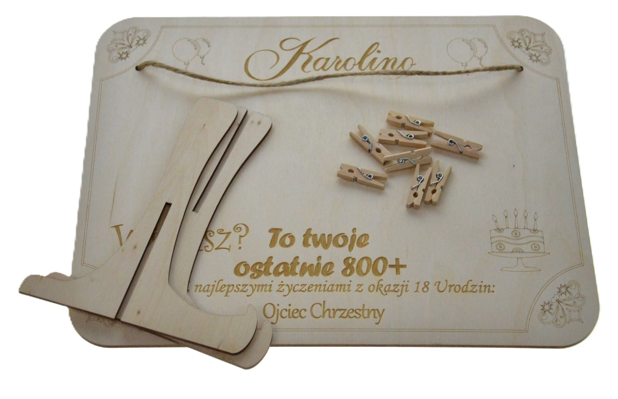 Szukasz wyjątkowego prezentu na 18 urodziny? Drewniana ramka „Widzisz, to Twoje ostatnie 800+” to oryginalny i zabawny upominek, który z pewnością wywoła uśmiech na twarzy Solenizanta lub Solenizantki! Idealny gadżet na osiemnastkę, który stanie się pamiątką na długie lata.