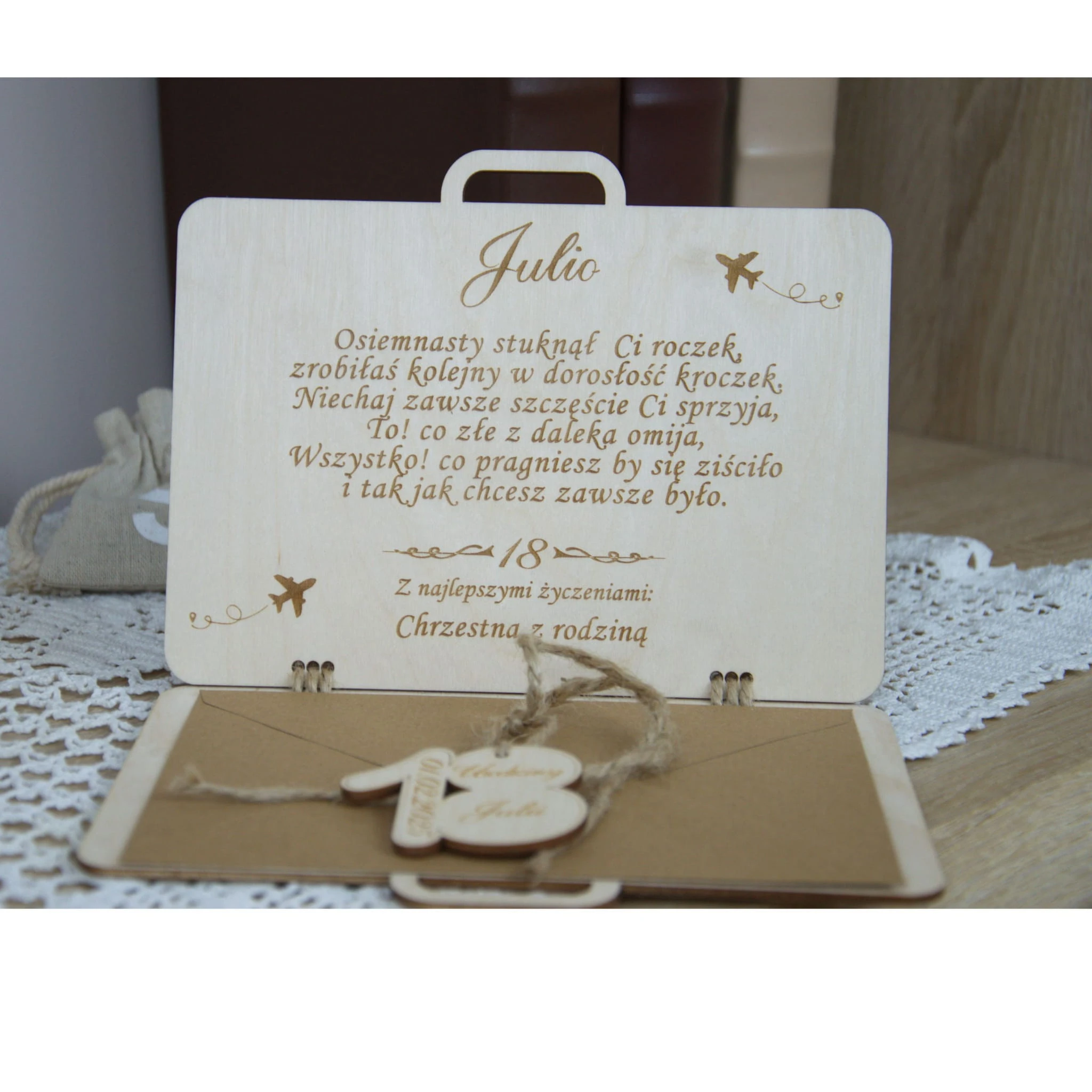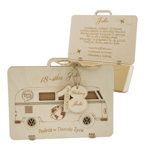Ta drewniana walizeczka jest właśnie dla CIEBIE! Wykonana z wysokiej jakości drewna brzozowego, zapewnia trwałość i prestiżowy wygląd,uroku dodają jej ozdobienia w kolorze dąb sonoma. W zestawie piękna przywieszka do związania walizeczki oraz wygrawerowane życzenia wewnątrz aby Twój gest był jeszcze bardziej osobisty.