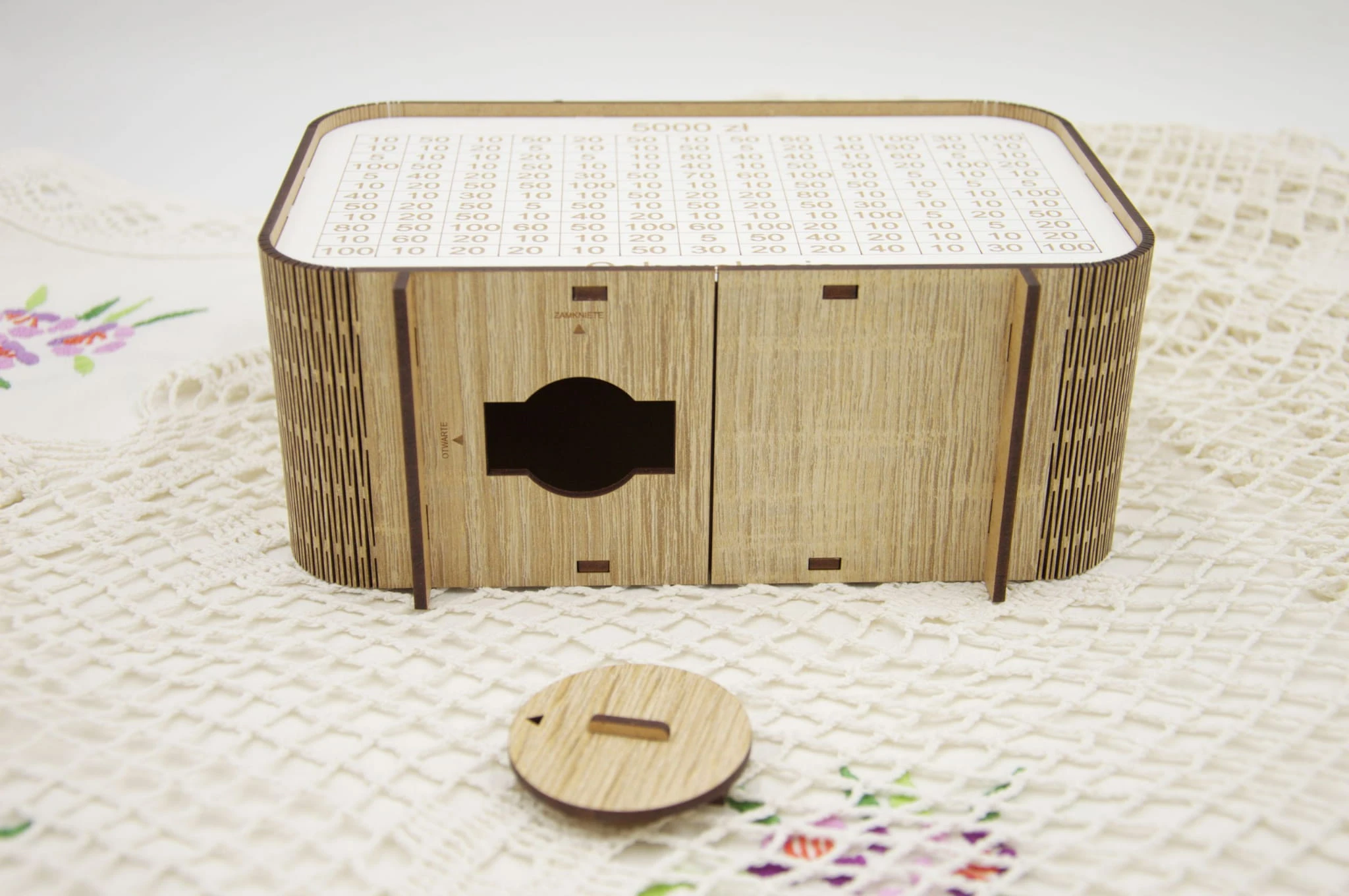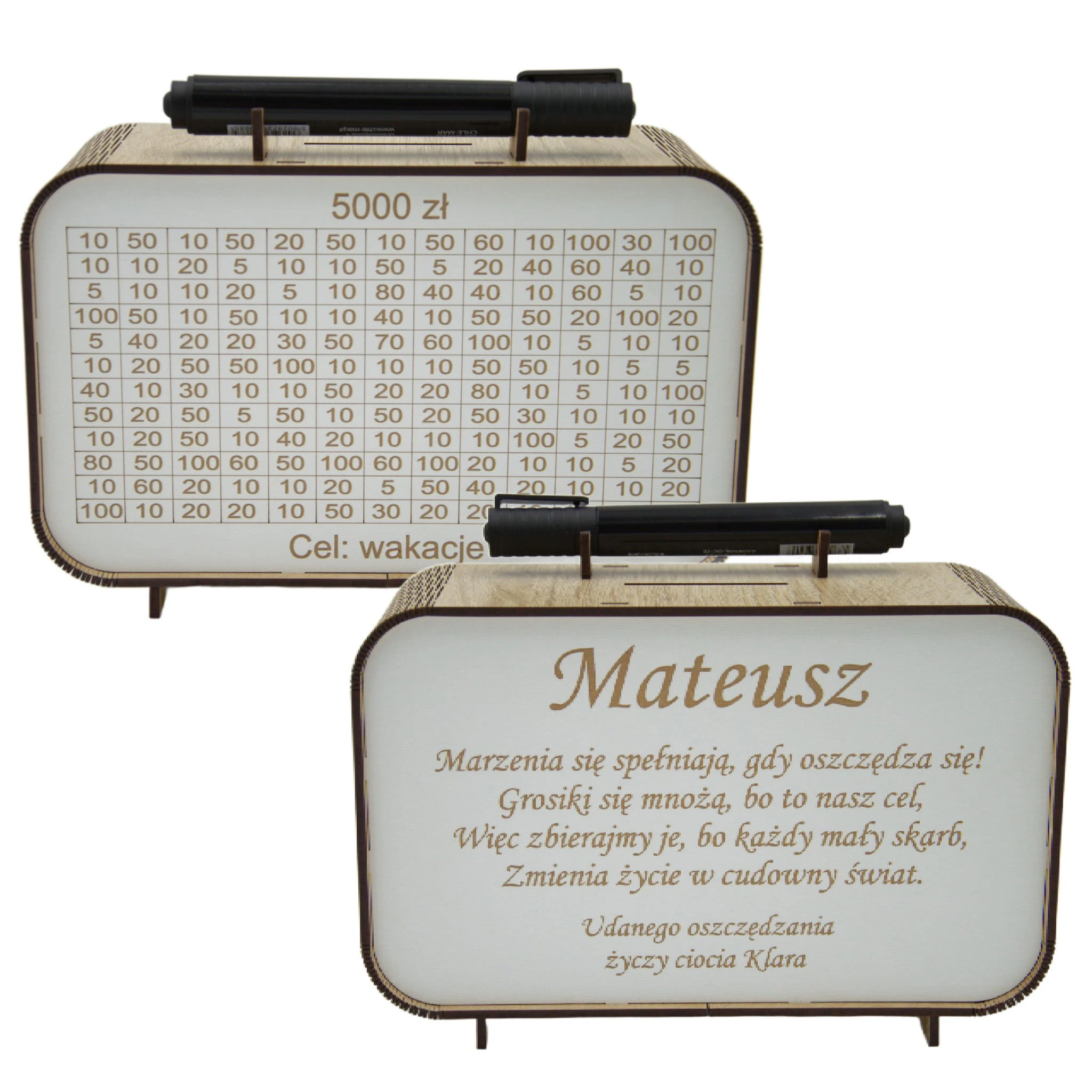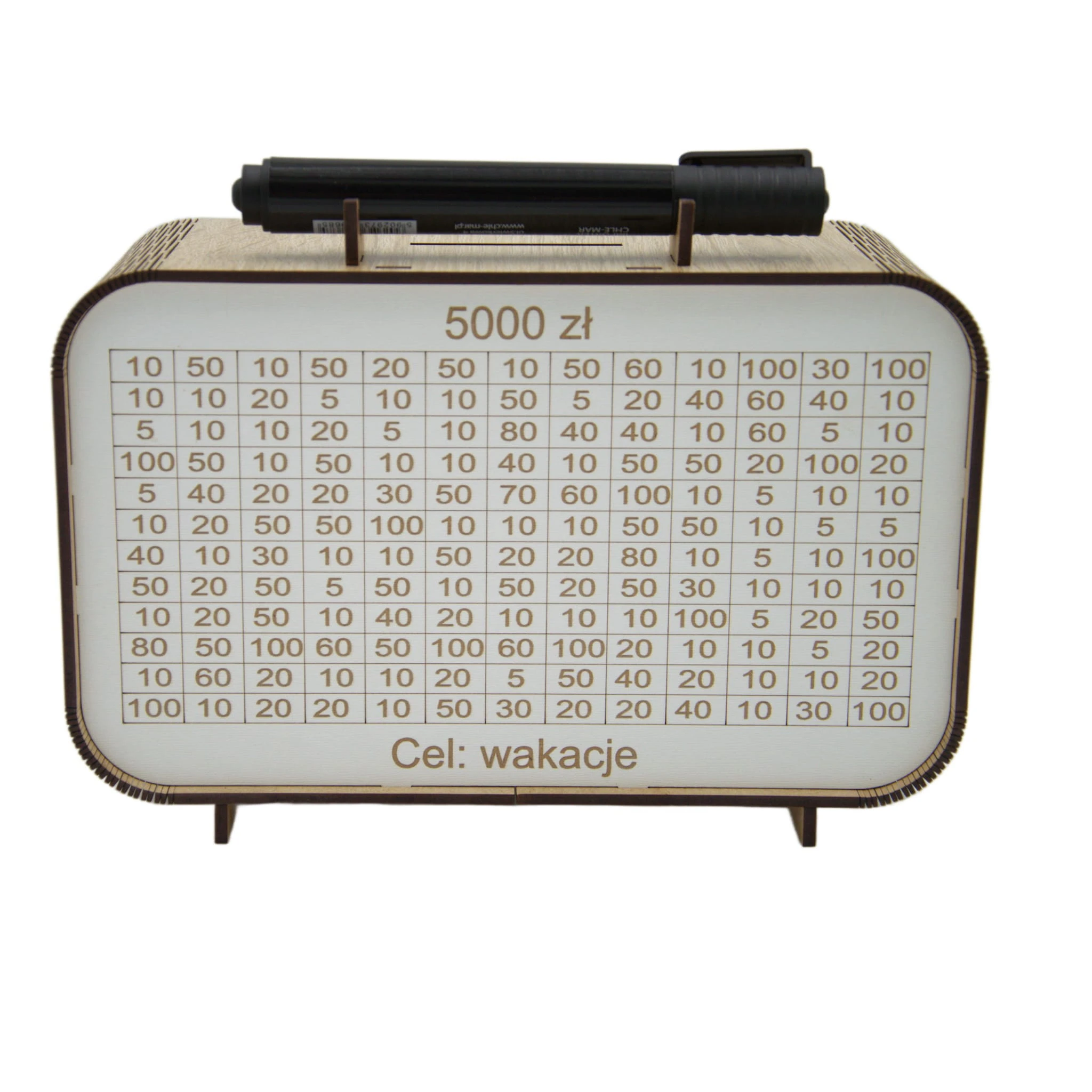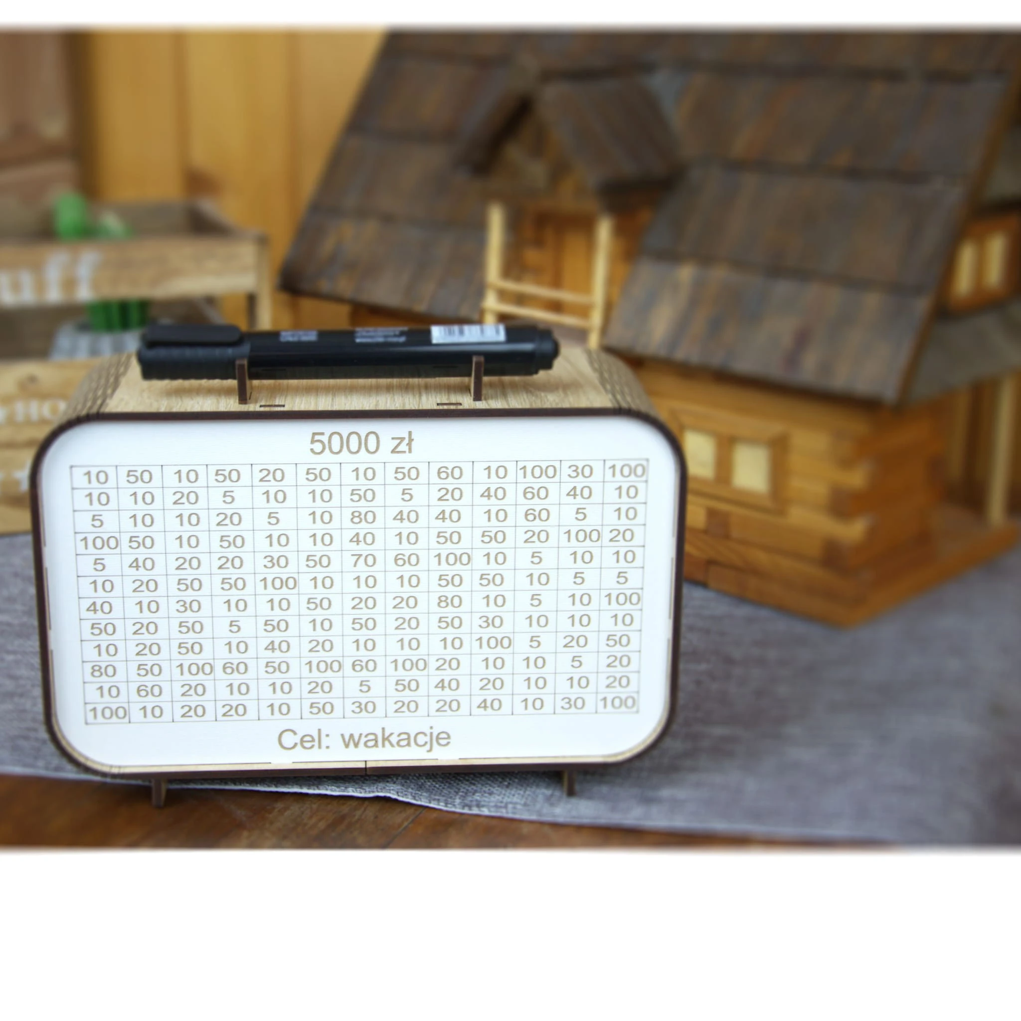 Ta drewniana skarbonka z trackerem oszczędzania to coś więcej niż zwykły pojemnik na pieniądze. Każda wpłata to mały sukces, który możesz odznaczyć wykreślając pole – widzisz postęp i motywujesz się do dalszego działania.