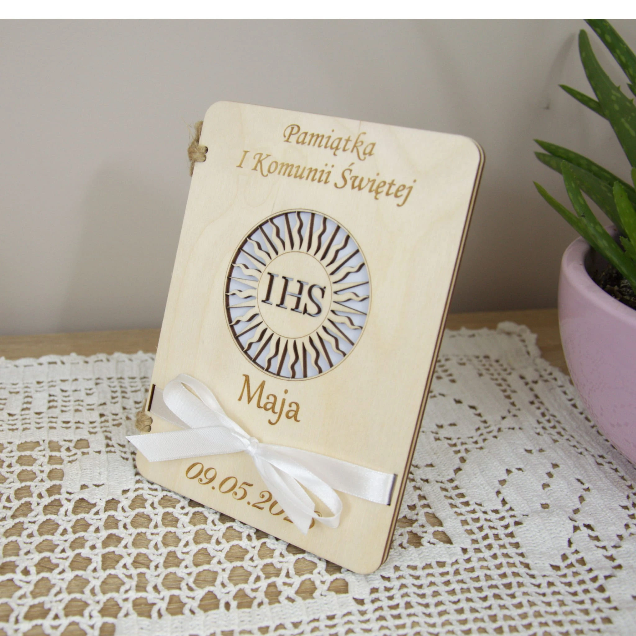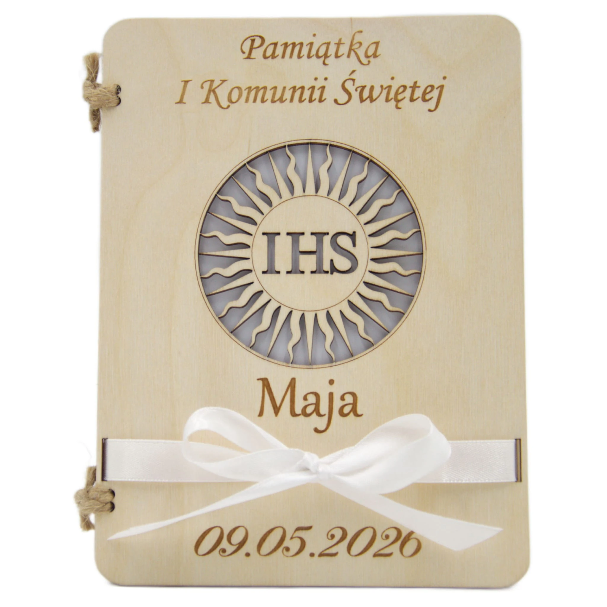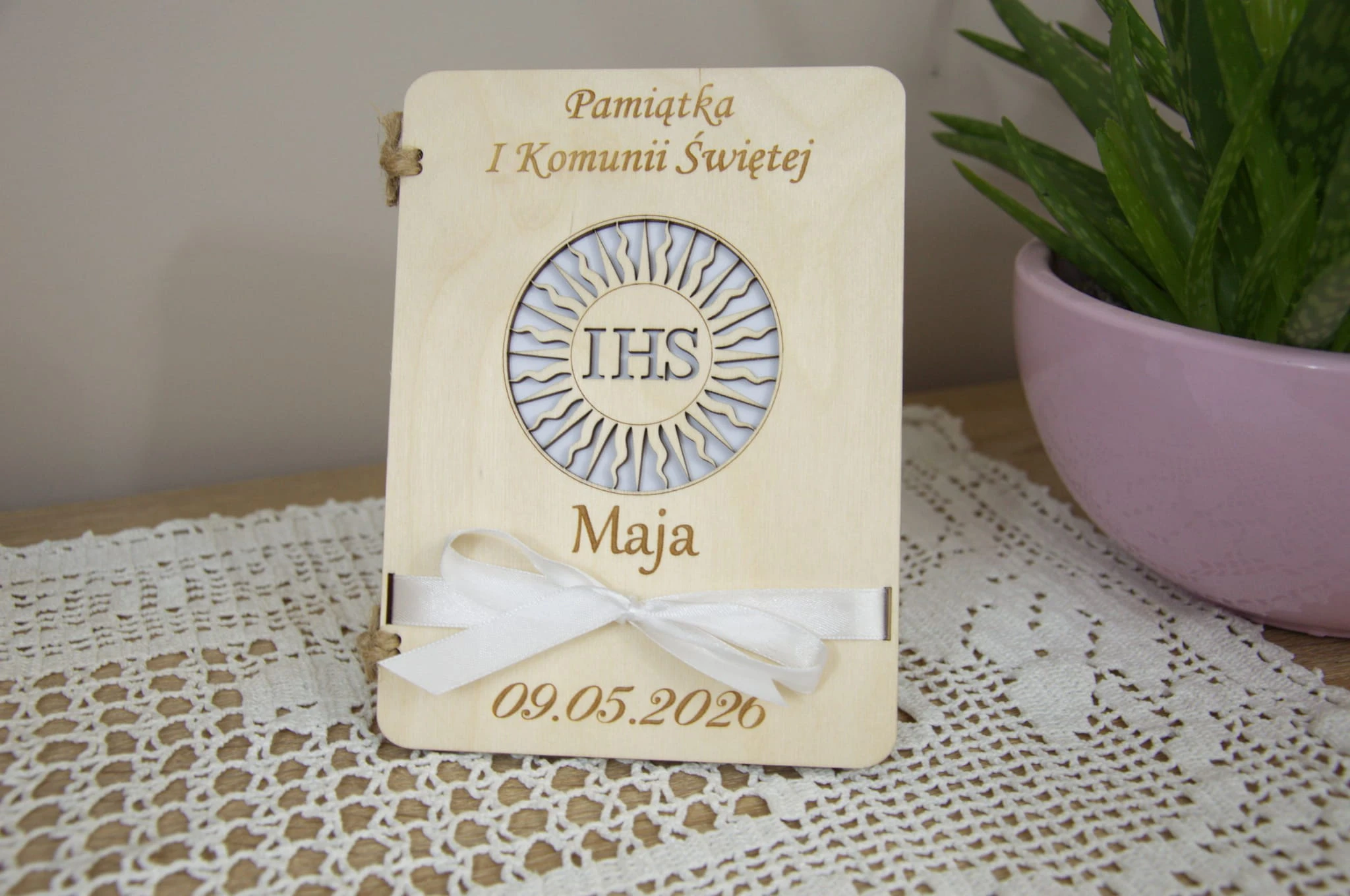 Naturalne drewno, symbol eucharystyczny IHS oraz delikatna biała wstążka tworzą wyjątkowy upominek, który będzie przypominał o tym szczególnym dniu przez wiele lat.