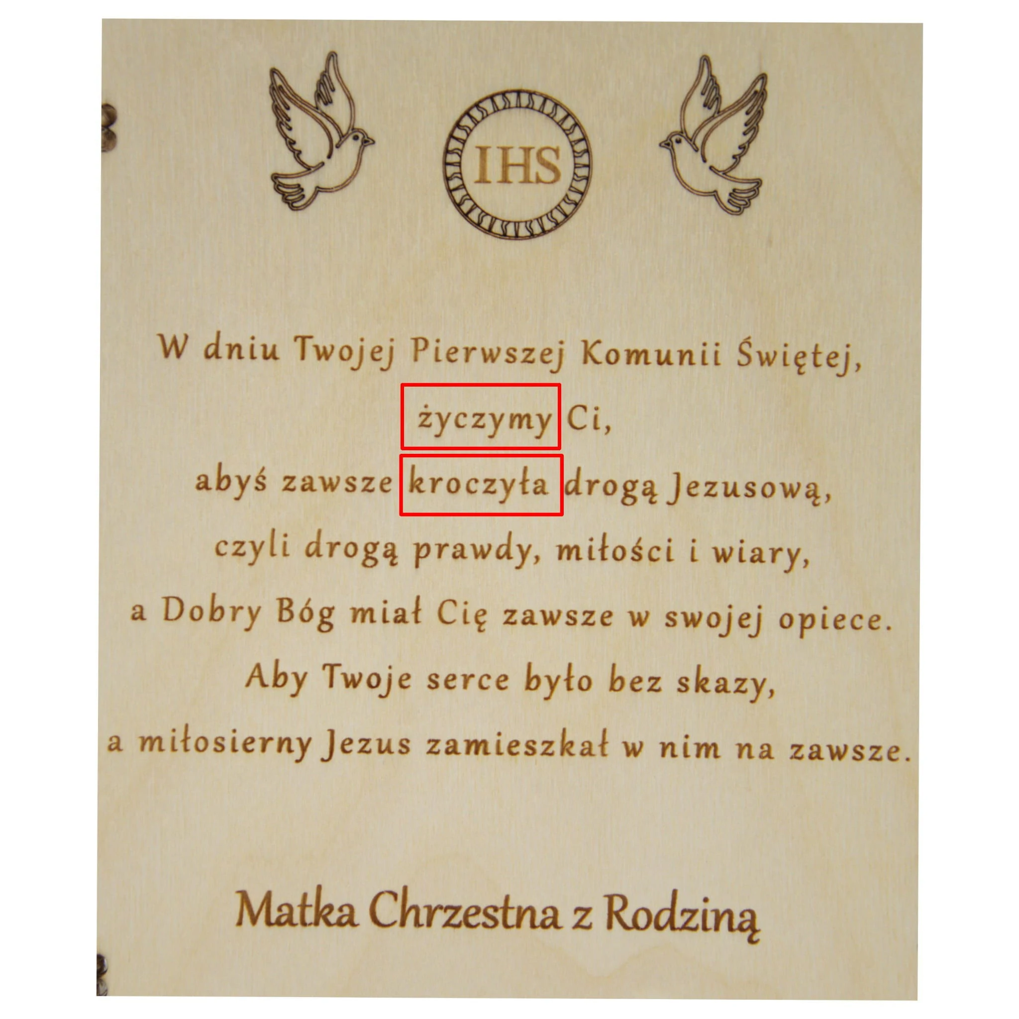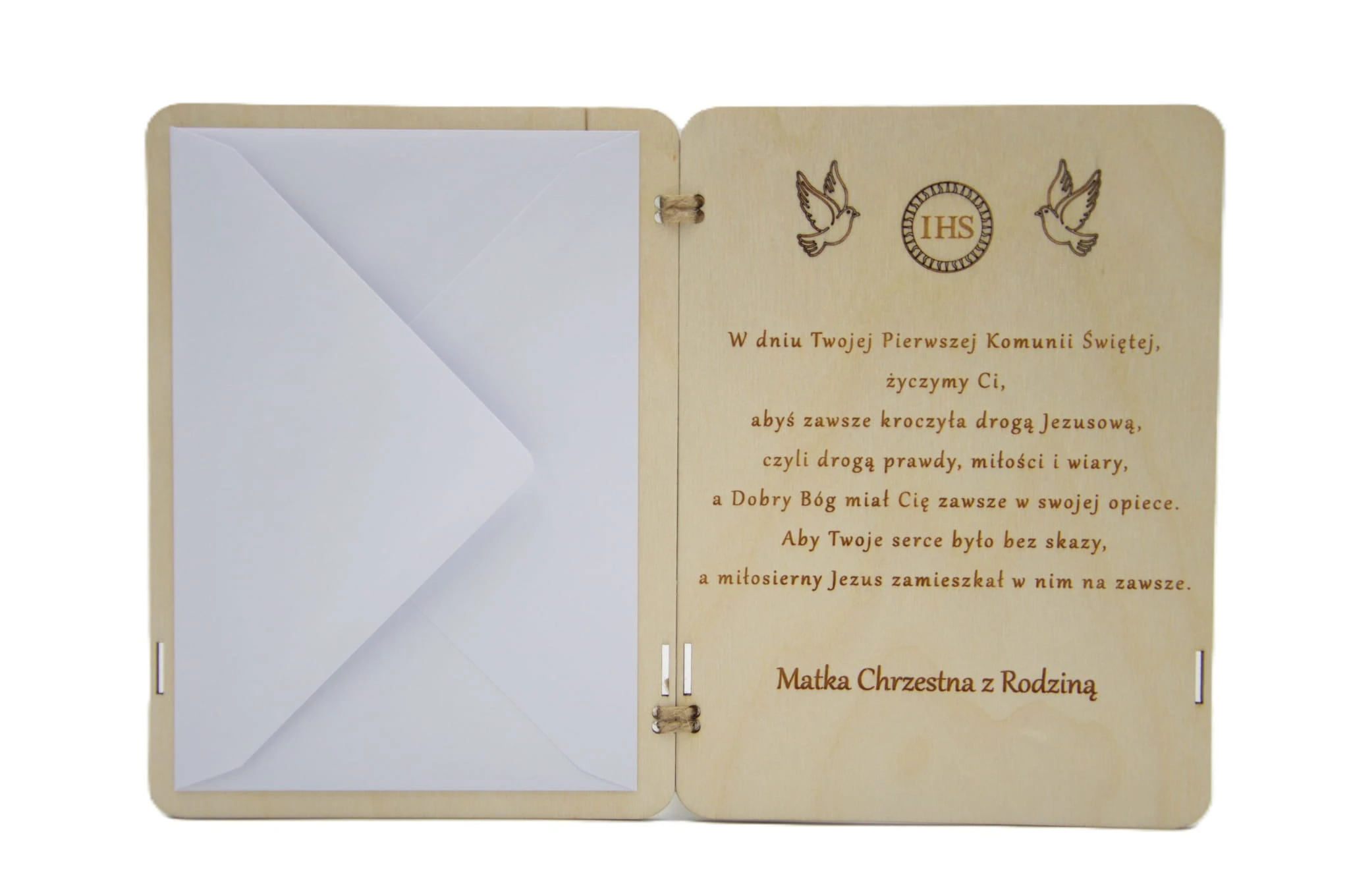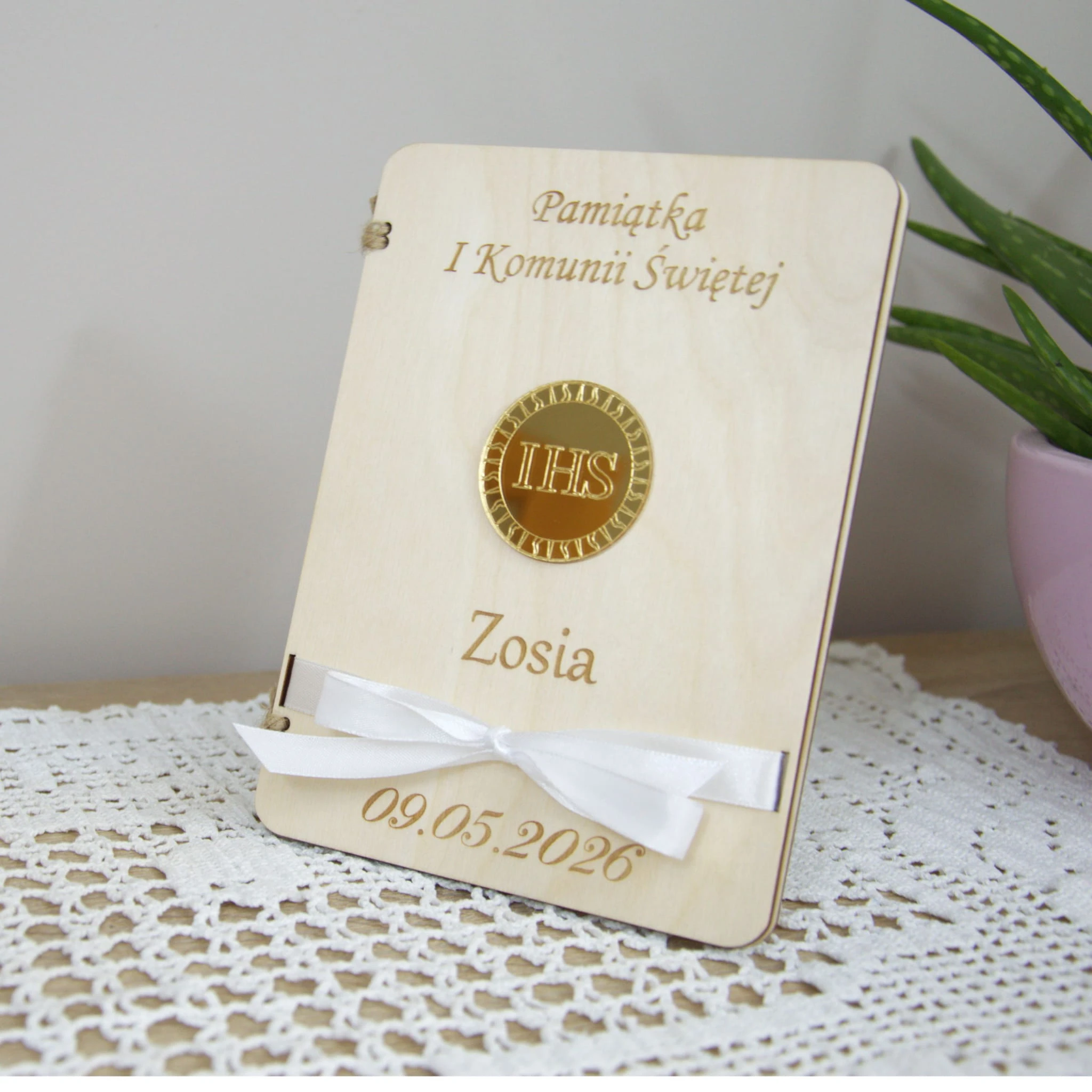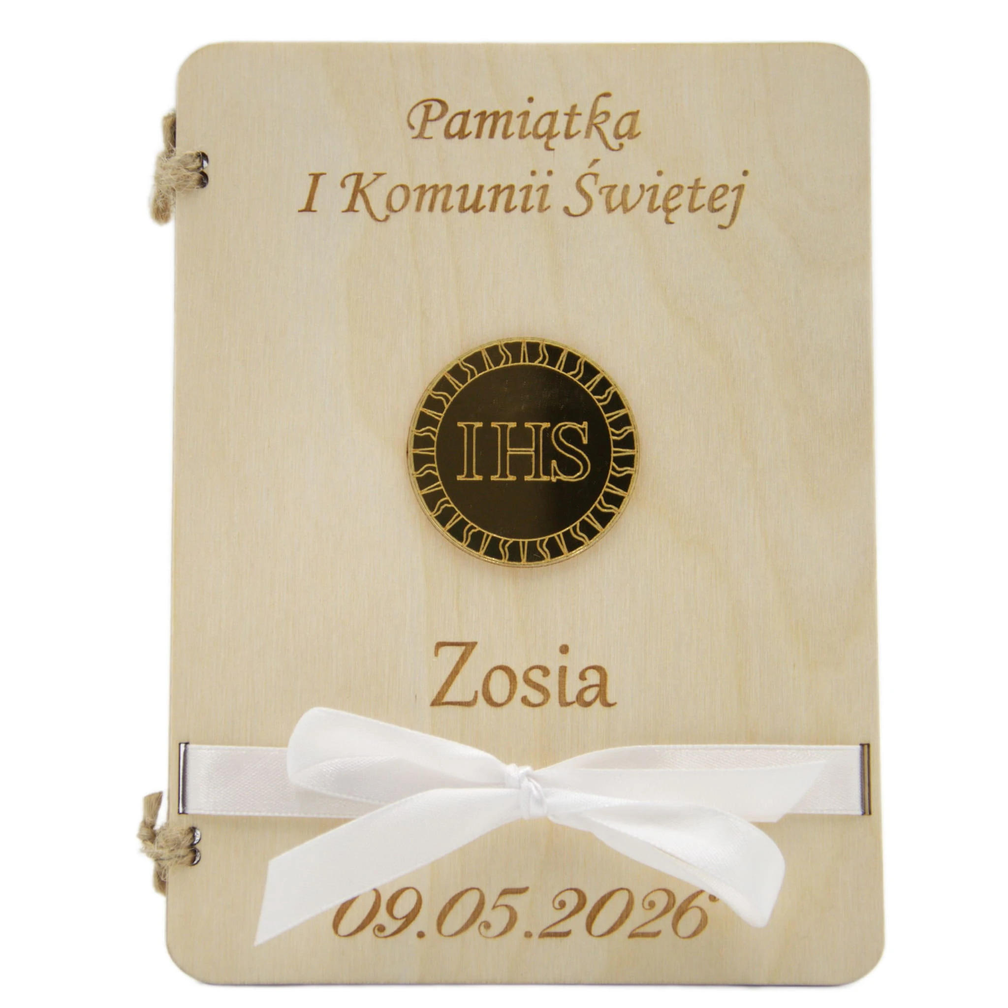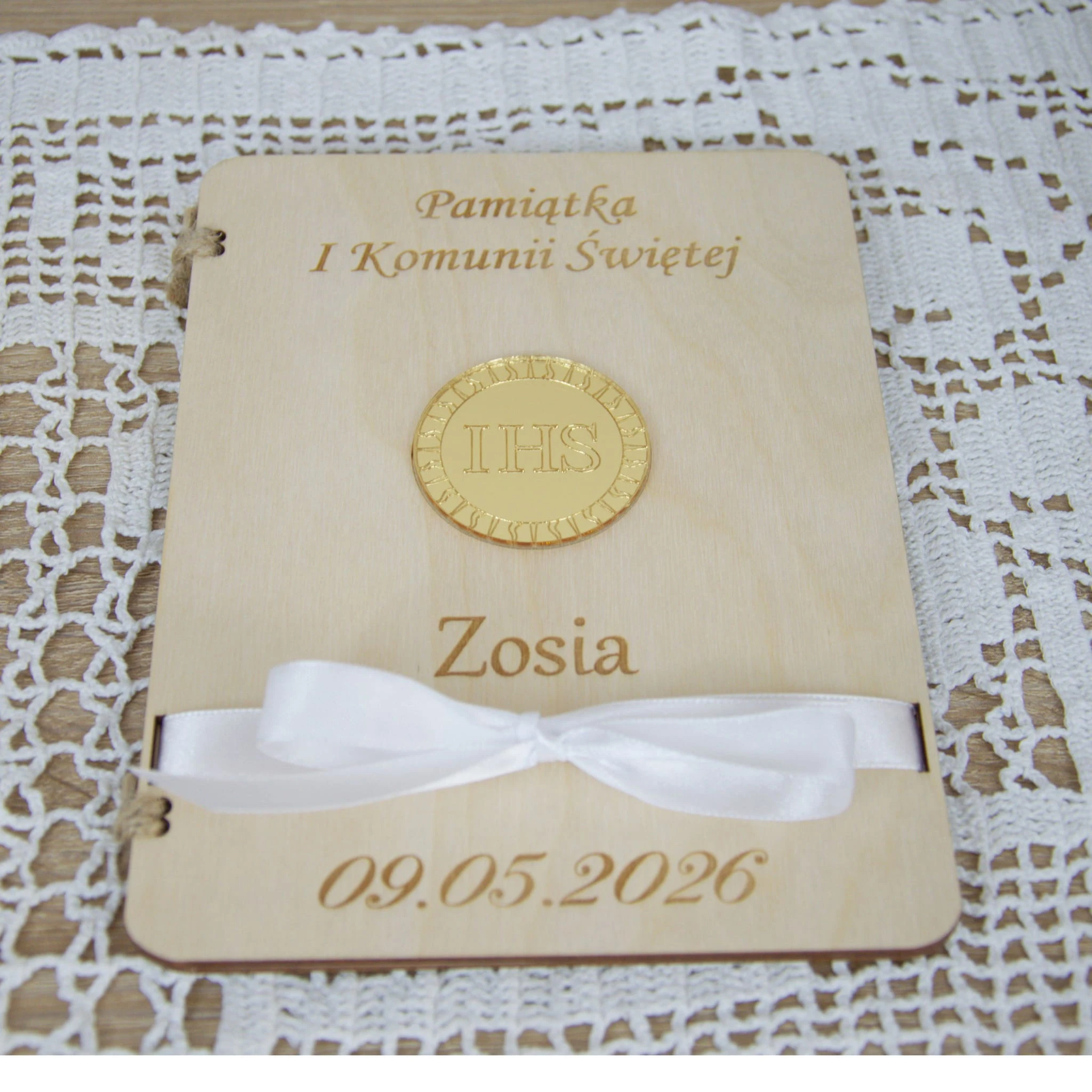 Naturalne drewno, symbol eucharystyczny IHS oraz delikatna biała wstążka tworzą wyjątkowy upominek, który będzie przypominał o tym szczególnym dniu przez wiele lat.