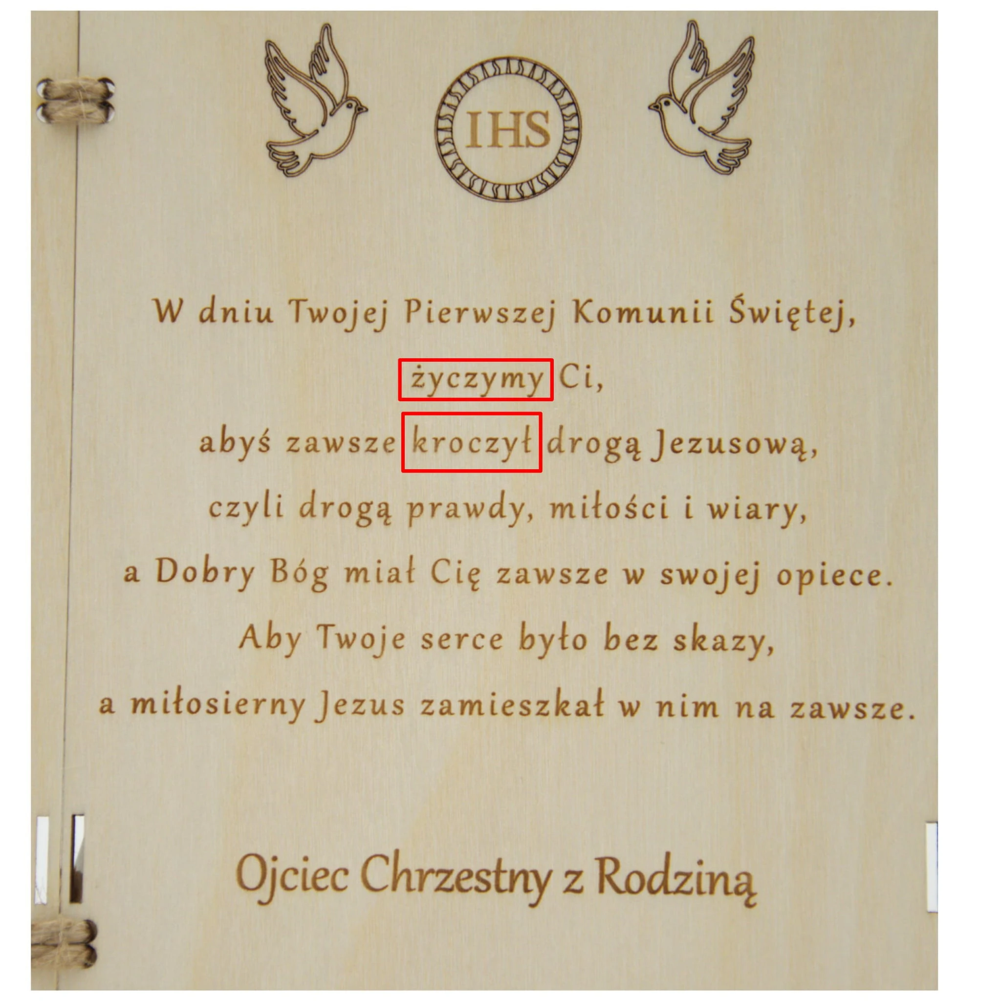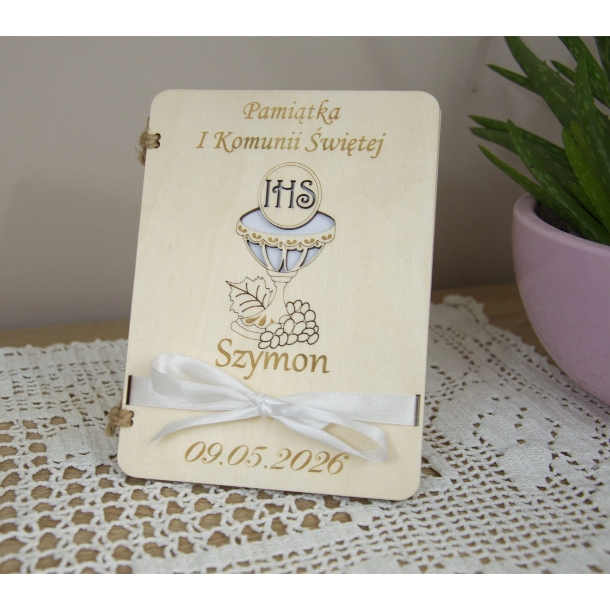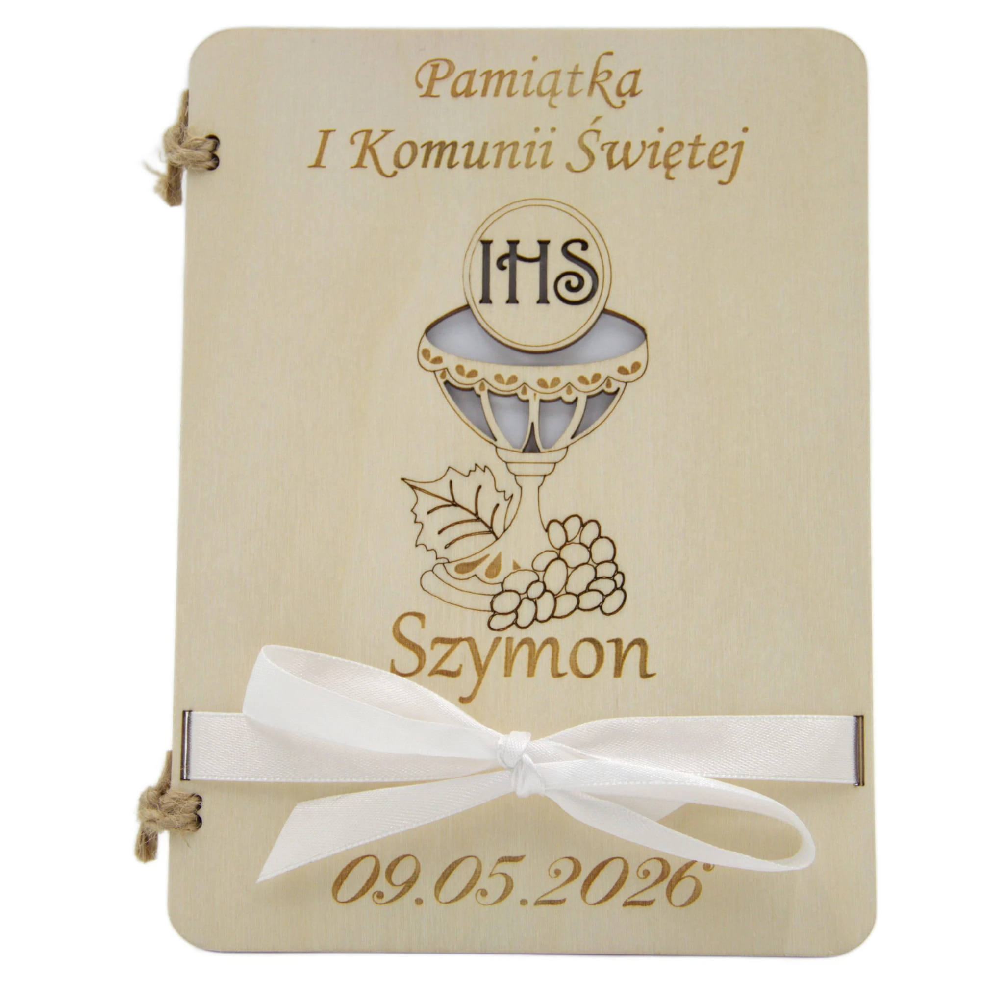 Naturalne drewno, symbol eucharystyczny IHS oraz delikatna biała wstążka tworzą wyjątkowy upominek, który będzie przypominał o tym szczególnym dniu przez wiele lat.