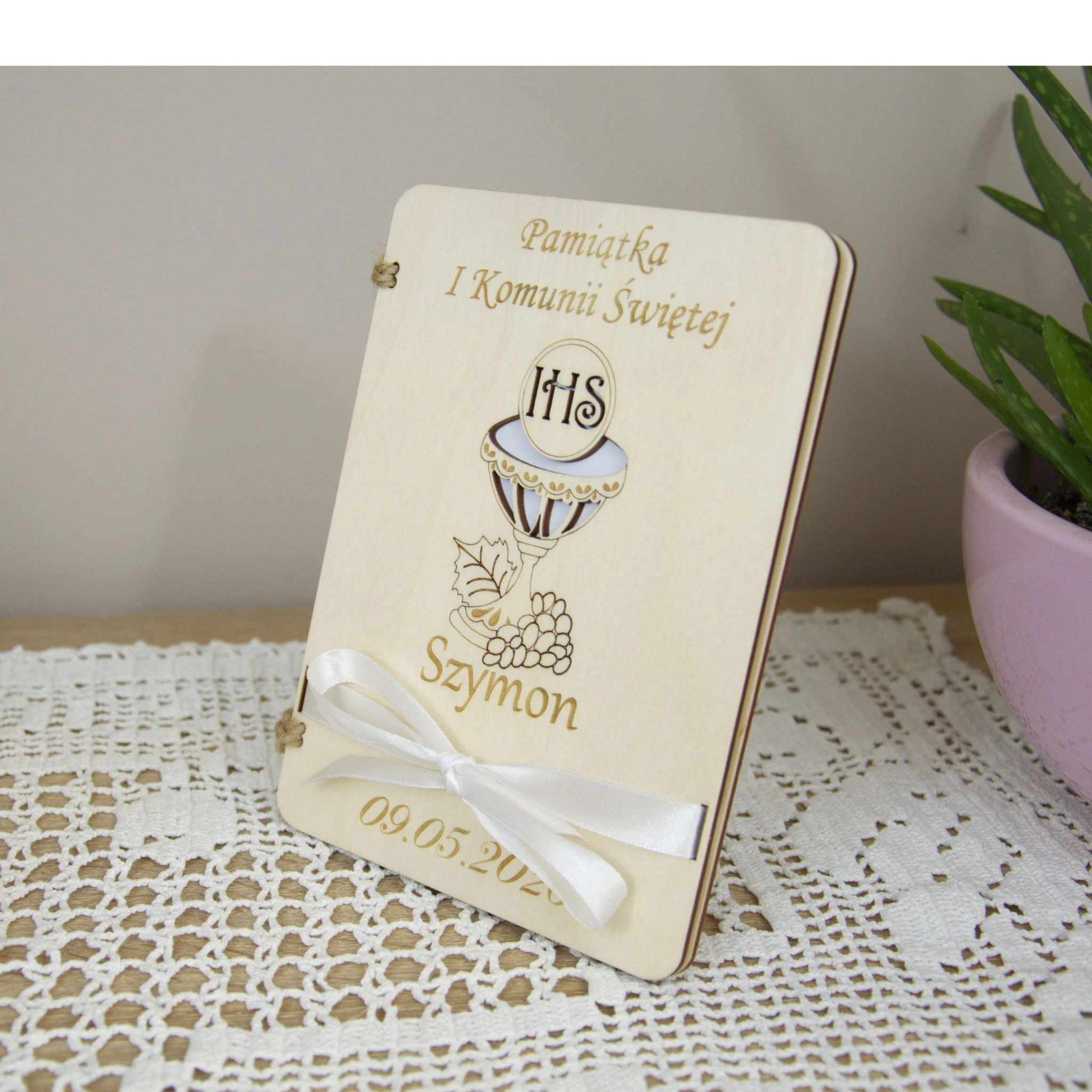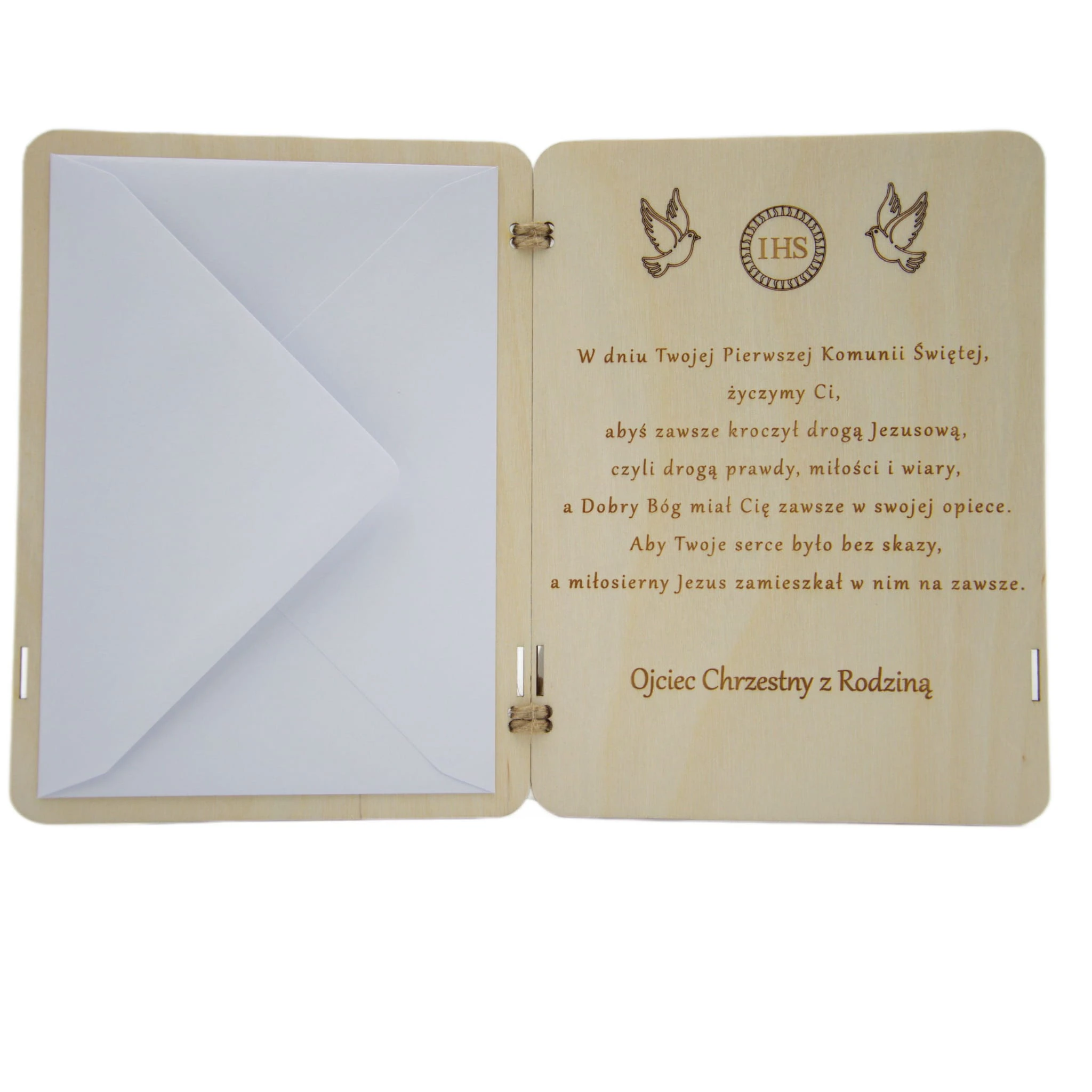 Elegancka drewniana kartka komunijna z personalizowanym grawerem to piękna i trwała pamiątka jednej z najważniejszych chwil w życiu dziecka.