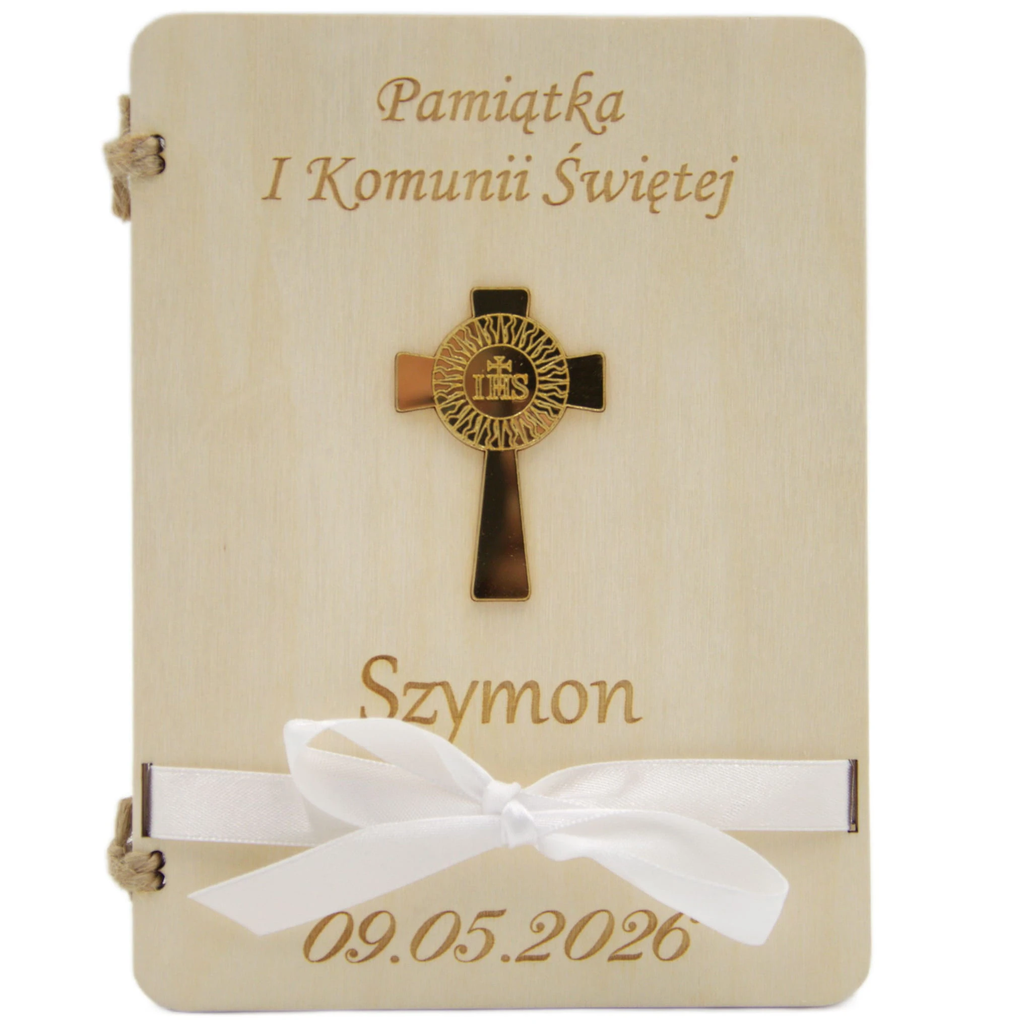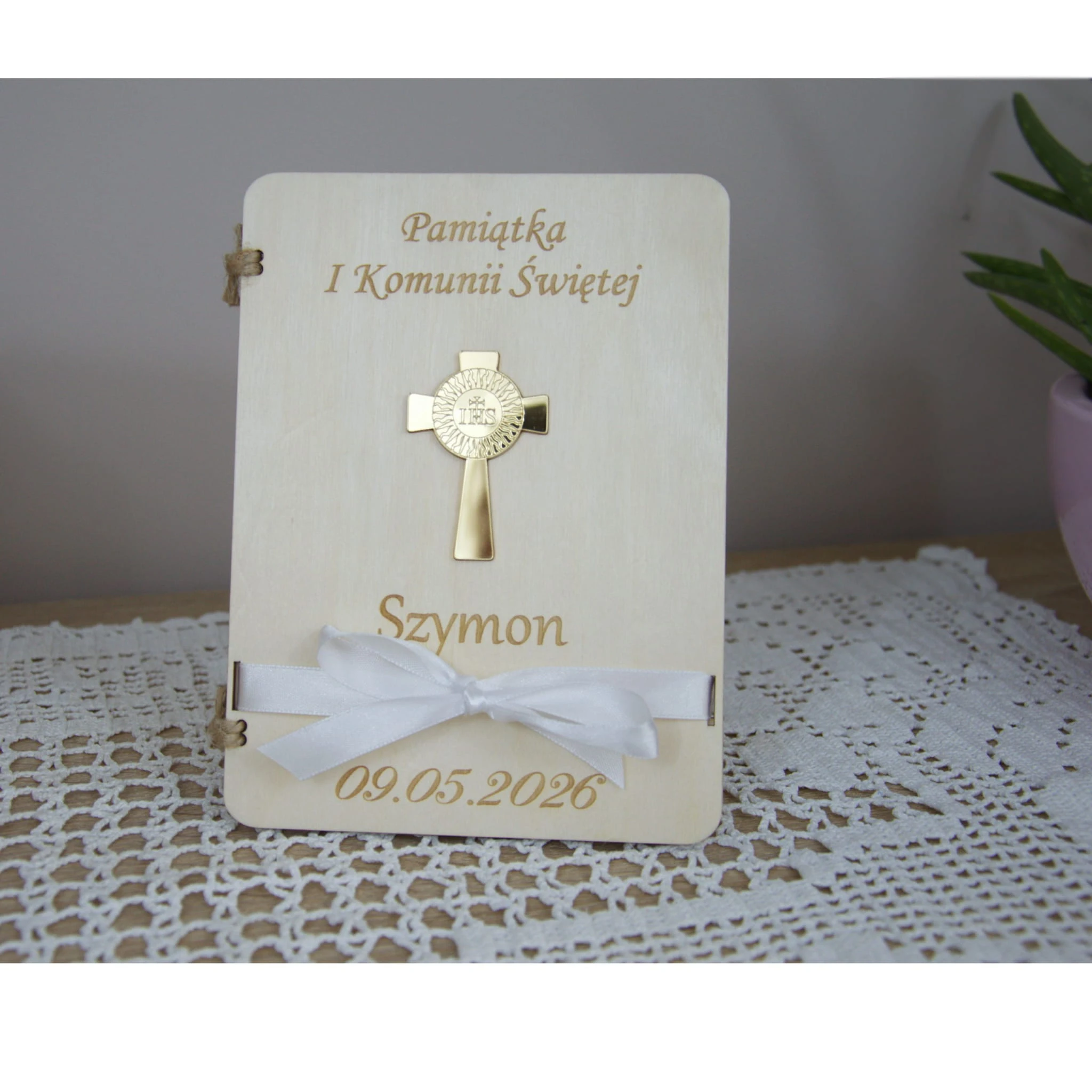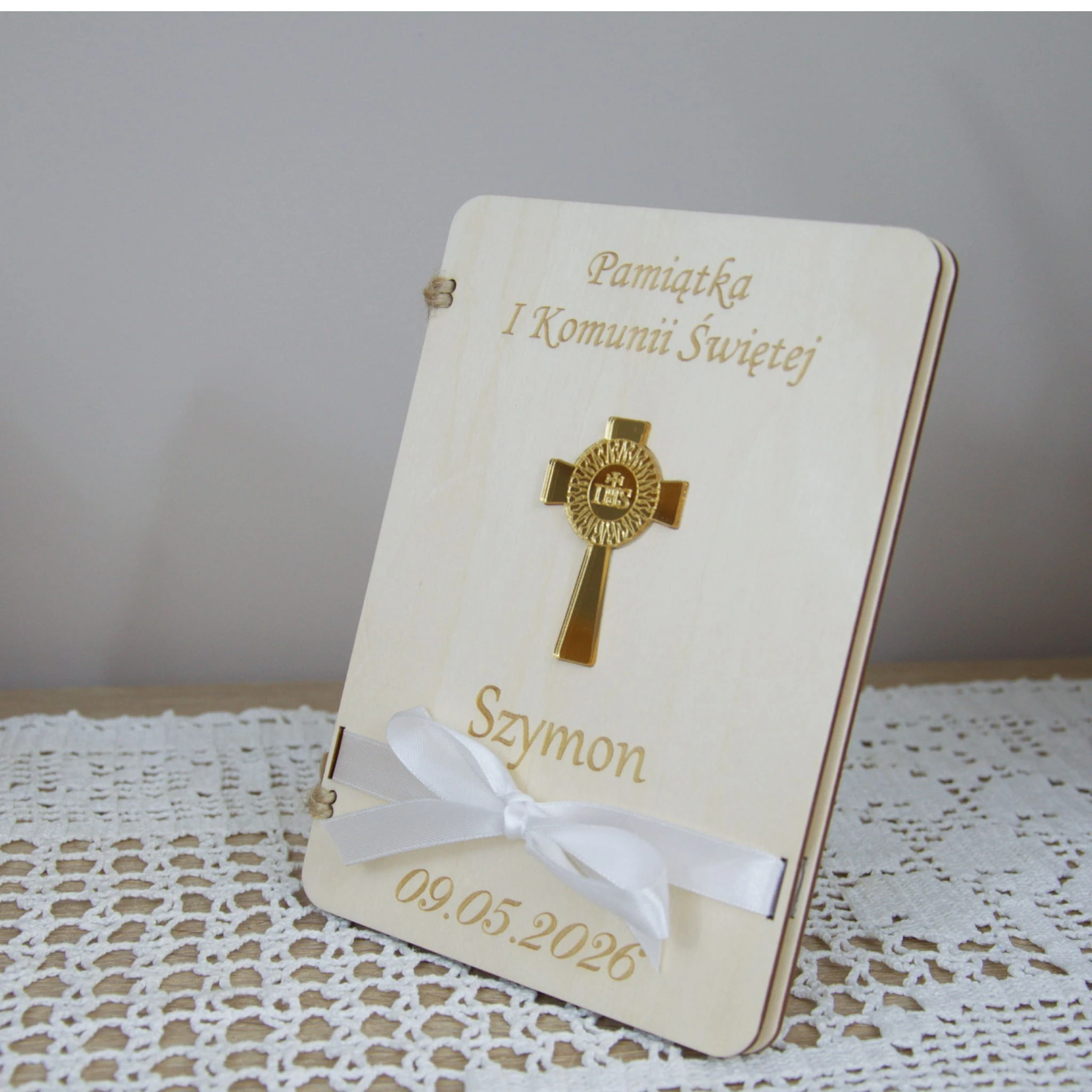 Naturalne drewno, symbol eucharystyczny IHS oraz delikatna biała wstążka tworzą wyjątkowy upominek, który będzie przypominał o tym szczególnym dniu przez wiele lat.
